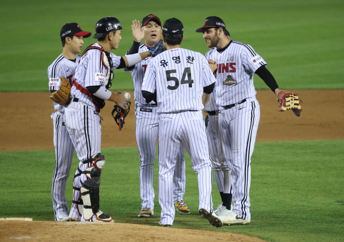 LG 선수들이 롯데에 2-1로 승리하며 8연승과 동시에 10승에 선착한 후 기쁨을 나누고 있다.
