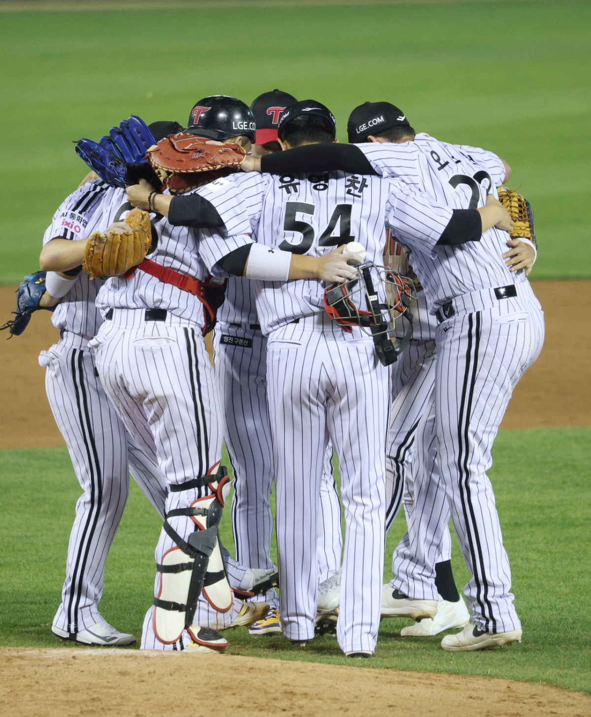LG 선수들이 롯데에 2-1로 승리하며 8연승과 동시에 10승에 선착한 후 기쁨을 나누고 있다.