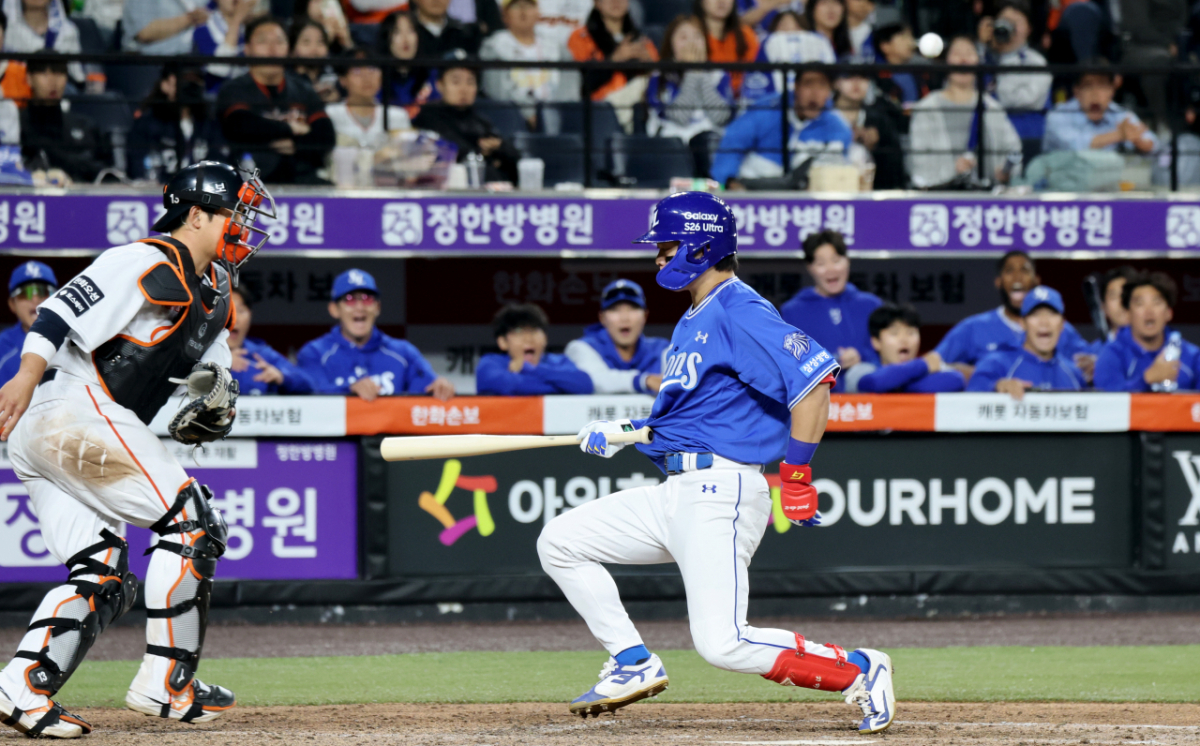 삼성 1번타자 박승규가 14일 대전한화생명볼파크에서 열리는 2026KBO리그 한화이글스와 삼성라이온즈 경기 9회초 1사 1,2루에서 김서현의 볼에 맞고 있다. 2026.04.14.