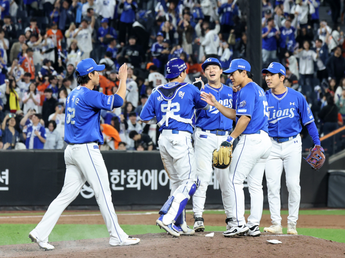 삼성 라이온즈 선수들이 14일 대전한화생명볼파크에서 열린 2026 KBO리그 한화 이글스와의 경기에서 9회말 수비를 마쳤다. 삼성은 8회 추격과 9회 역전으로 6-5 승리를 거두었다. 경기 후 삼성 선수들은 팬들에게 감사함을 전했고, 마무리 투수 김재윤은 포수 박세혁과 승리를 자축했다.