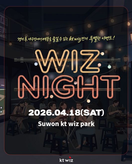 [OSEN=손찬익 기자] KT 위즈는 오는 18일 키움 히어로즈와의 경기 종료 후 위즈파크 2층 F&B 구역에서 야장 콘셉트의 ‘위즈 나잇(WIZ NIGHT)’를 운영한다고 밝혔다.