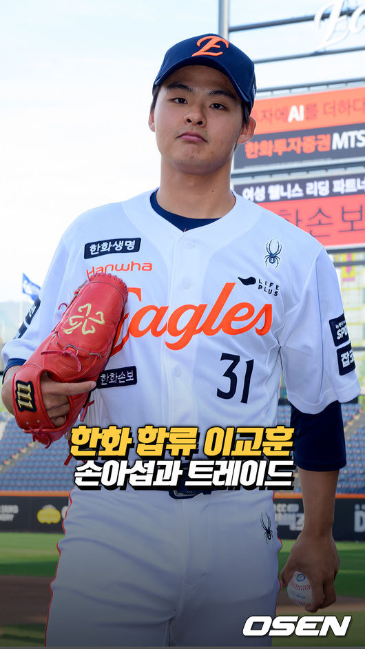 한화 이글스는 14일 외야수 손아섭을 두산 베어스로 보내고 좌완투수 이교훈과 현금 1억 5000만원을 받는 트레이드를 공식 발표했다. 한화 구단은 좌완 불펜 뎁스 강화를 위해 이교훈을 영입했다고 밝혔다. 군필 자원인 이교훈은 팀 내 좌완 투수들의 병역 공백을 메울 것으로 기대된다고 전했다.