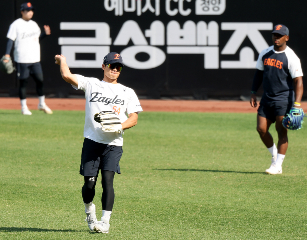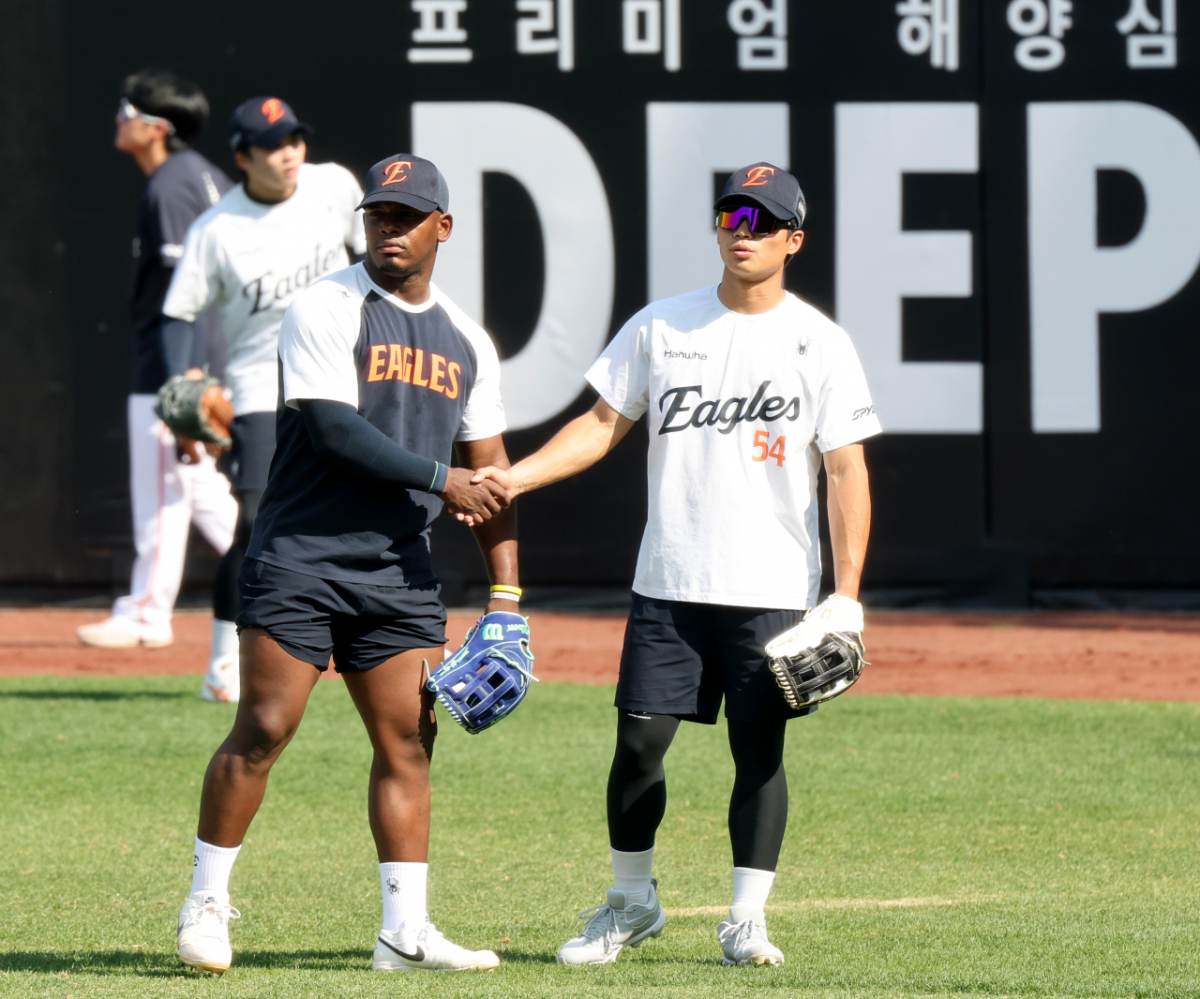 한화 외야수 오재원이 15일 대전한화생명볼파크에서 열리는 2026KBO리그 한화이글스와 삼성라이온즈 경기를 앞두고 페라자와 함께 외야수비훈련을 하고 있다.
