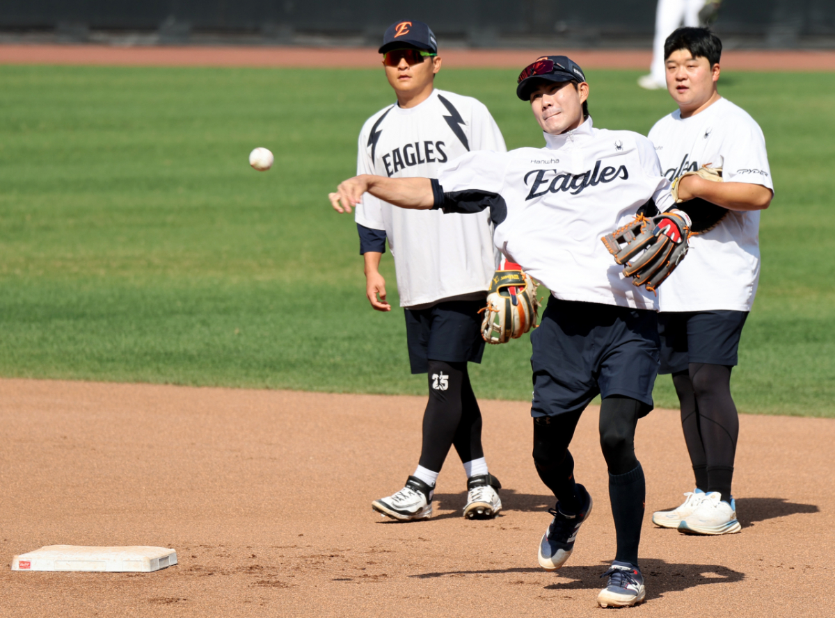 한화 유격수 심우준이 15일 대전한화생명볼파크에서 열리는 2026KBO리그 한화이글스와 삼성라이온즈 경기를 앞두고 수비훈련을 하고 있다. 2026.04.15.