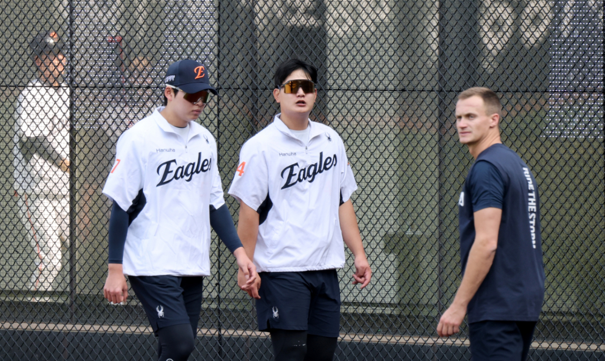 한화 김서현이 15일 대전한화생명볼프크에서 열리는 2026 KBO리그 한화이글스와 삼성라이온즈 경기를 앞두고 훈련을 마무리했다. 김서현은 훈련을 마치고 잭 쿠싱과 스쳐지나갔다. 이 장면은 '잭, 뒷문을 잘 부탁해'라는 제목의 포토 기사로 보도되었다.