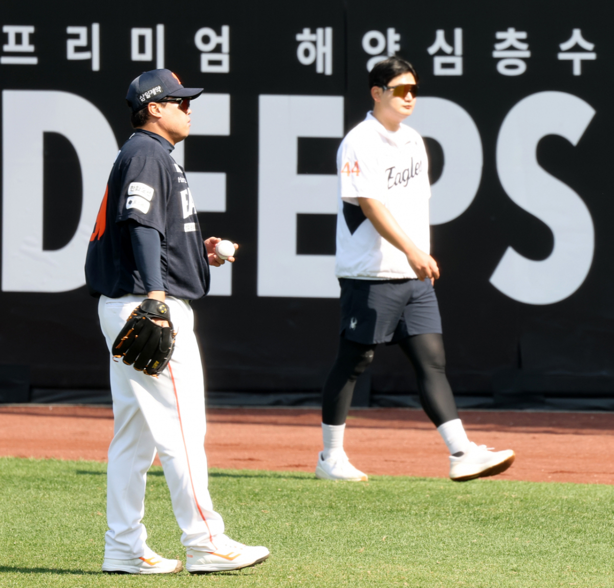 한화 류현진이 15일 대전한화생명볼파크에서 열리는 2026KBO리그 한화이글스와 삼성라이온즈 경기를 앞두고 피칭을 하며 몸을 풀고 있다. 펜스앞으로 지나가는 김서현. 2026.04.15.