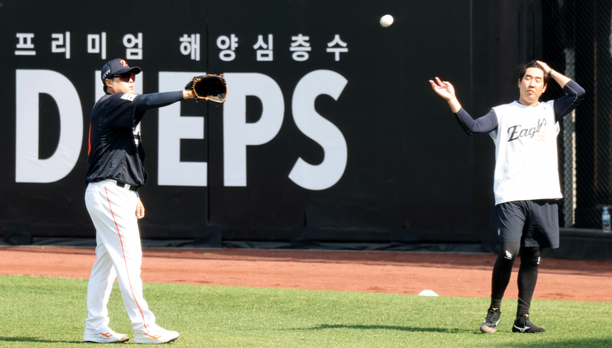 한화 류현진이 15일 대전한화생명볼파크에서 열리는 2026KBO리그 한화이글스와 삼성라이온즈 경기를 앞두고 피칭을 하며 몸을 풀고 있다. 펜스앞으로 지나가는 박상원. 2026.04.15.
