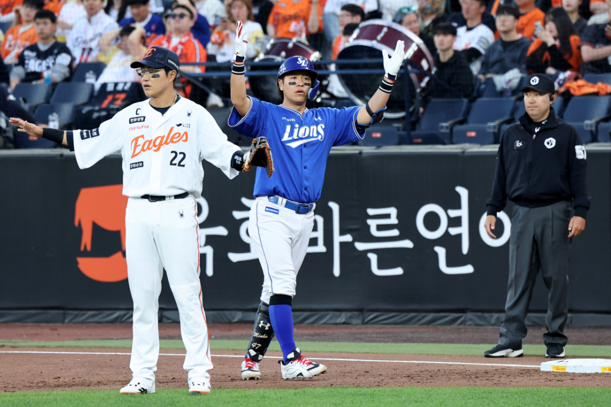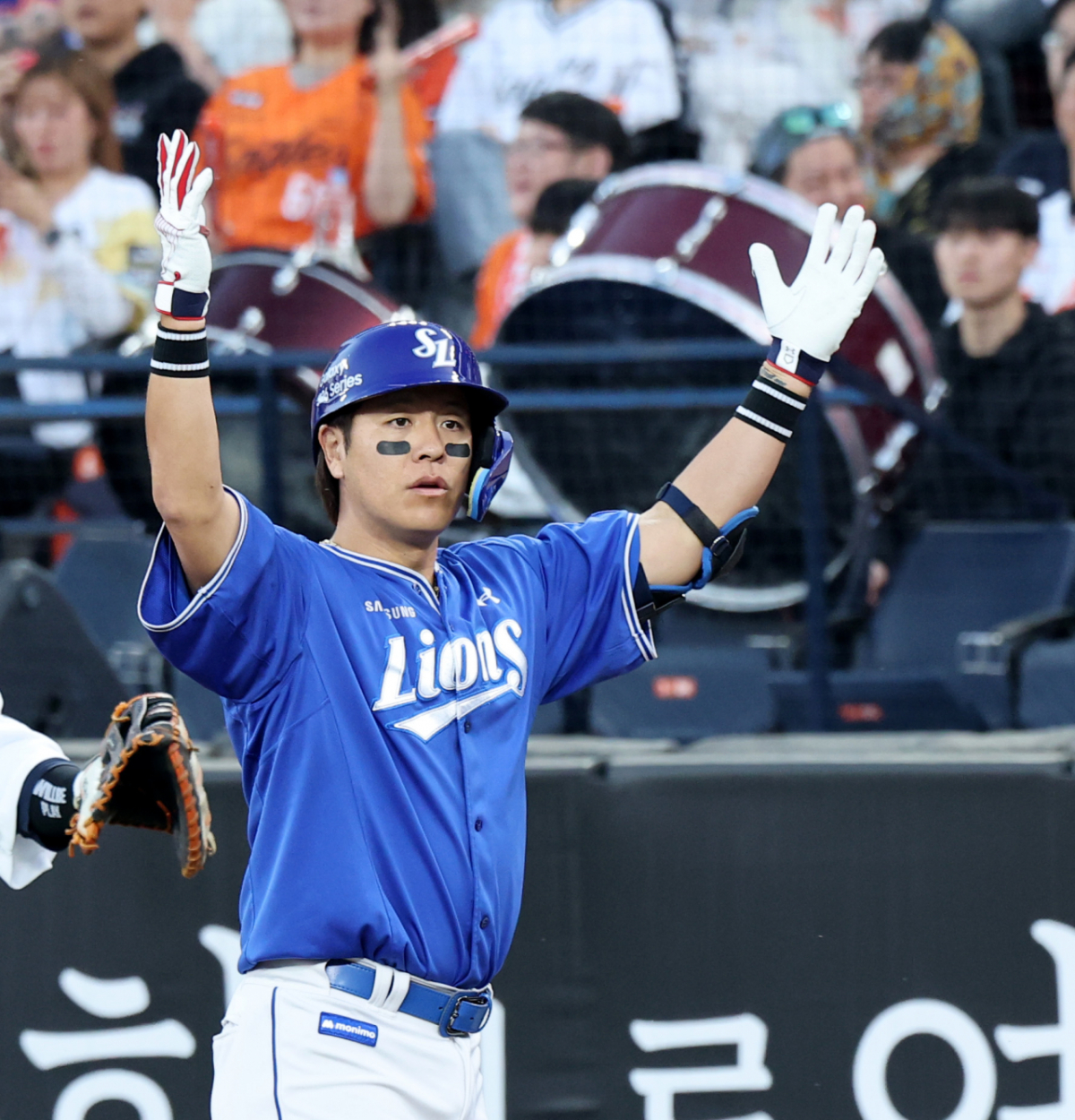 삼성 6번타자 강민호가 15일 대전한화생명볼파크에서 열리는 2026KBO리그 한화이글스와 삼성라이온즈 경기 1회초 만루에서 안타를 친 후 자축하고 있다. 2026.04.15.