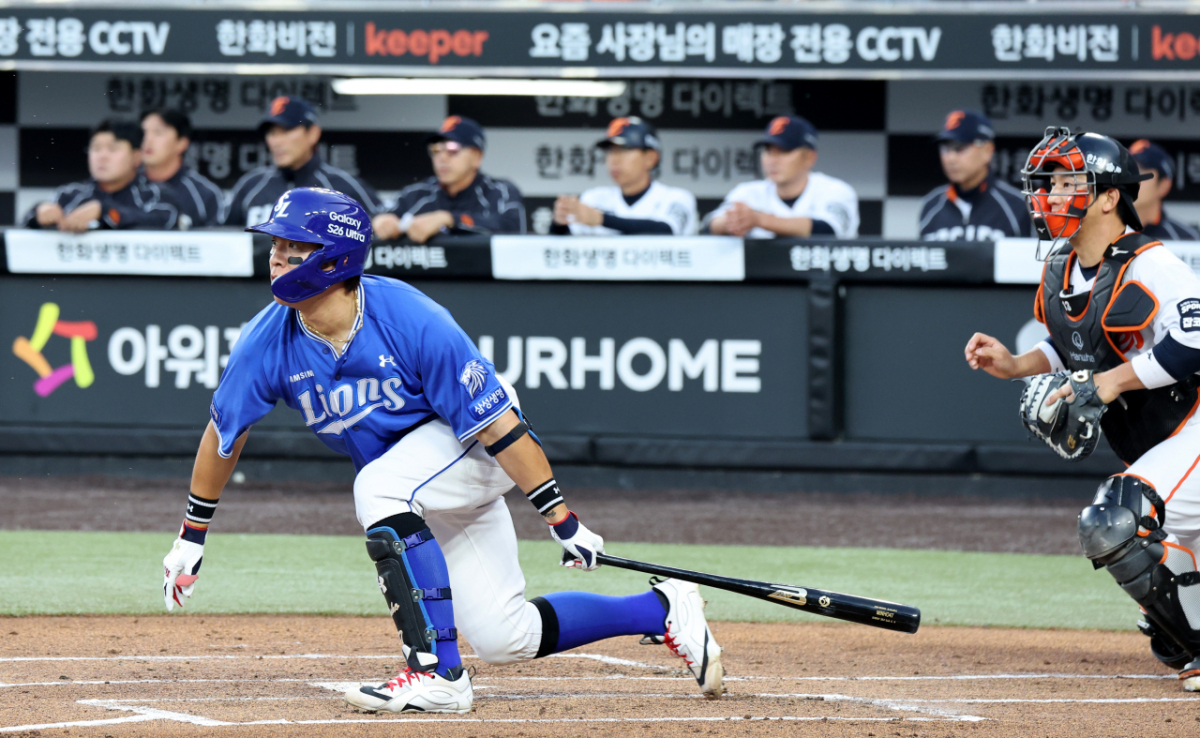 삼성 라이온즈의 6번 타자 강민호가 15일 대전한화생명볼파크에서 열린 2026 KBO리그 한화 이글스와의 경기 1회초 만루 상황에서 안타를 쳤다. 그는 1회초 1타점 안타를 기록했다. 강민호는 안타를 친 후 자축했다.