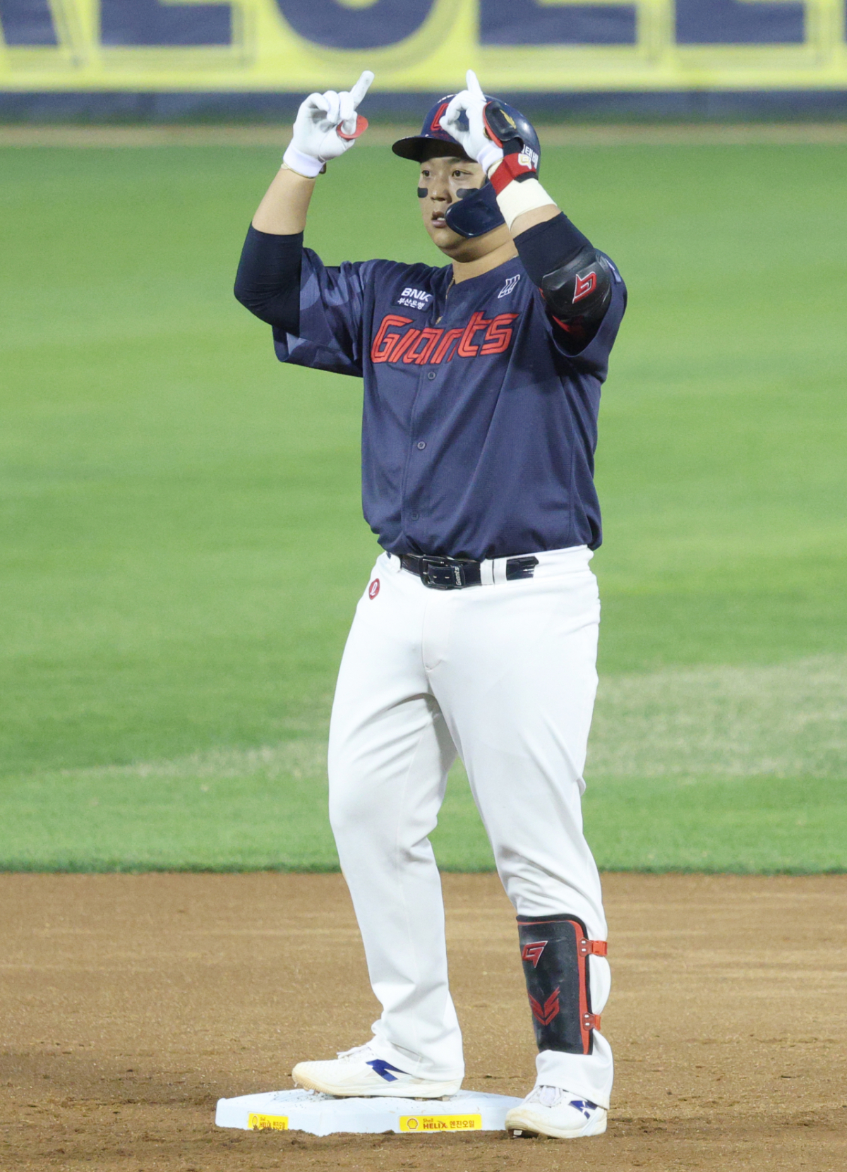 롯데 한동희가 4회초 2사에서 우중간 2루타를 날리고 출루한 후 세리머니를 하고 있다.