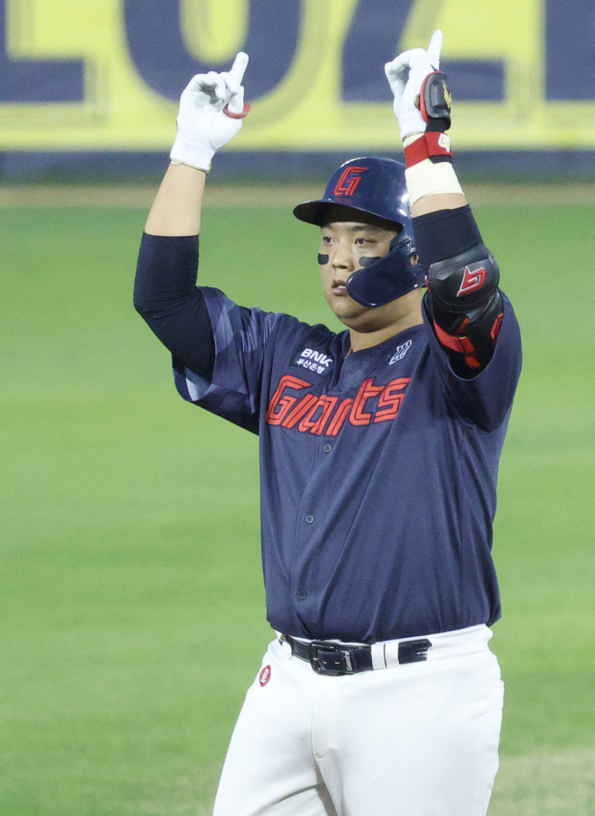 롯데 한동희가 4회초 2사에서 우중간 2루타를 날리고 출루한 후 세리머니를 하고 있다.
