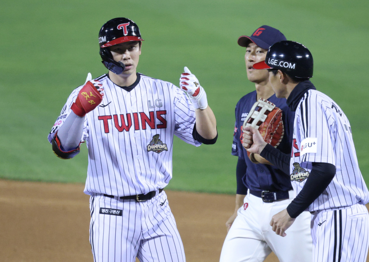 LG 홍창기가 5회말 2사에서 좌전 안타로 출루한 후 세리머니를 하고 있다.
