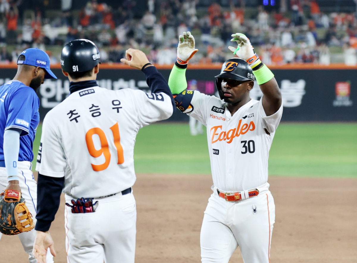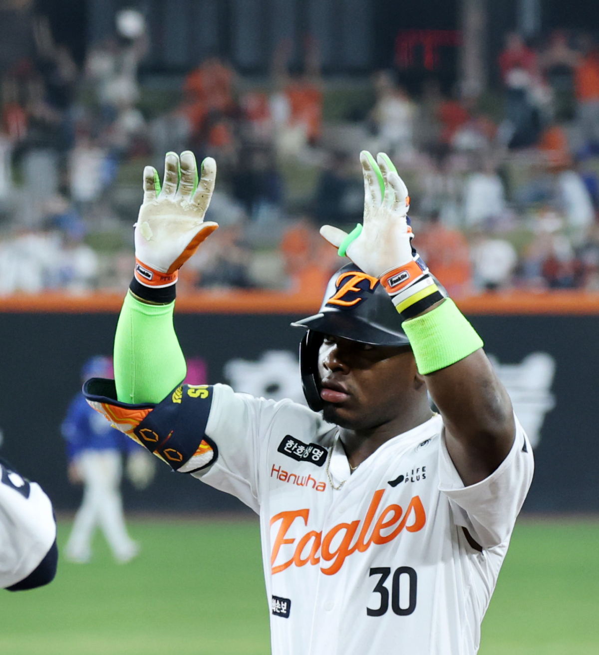 한화 2번타자 페라자가 15일 대전한화생명볼파크에서 열리는 2026KBO리그 한화이글스와 삼성라이온즈 경기 2회말 1타점 안타로 출루하고 있다. 2026.04.15.