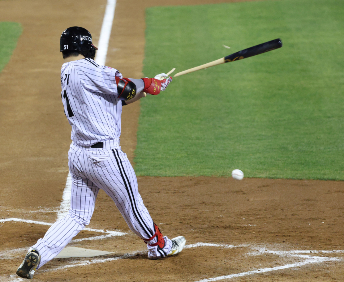 LG 홍칭기가 7회말 1사 2루에서 회심의 타격을 했으니 방망이가 부러지며 내야땅볼이 되고 있다.