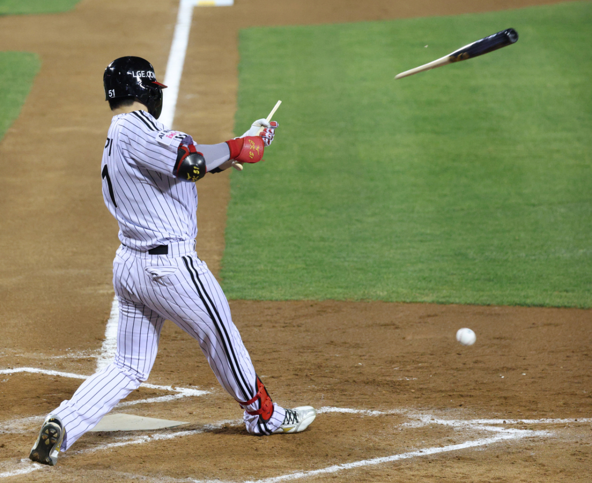 LG 홍칭기가 7회말 1사 2루에서 회심의 타격을 했으니 방망이가 부러지며 내야땅볼이 되고 있다.
