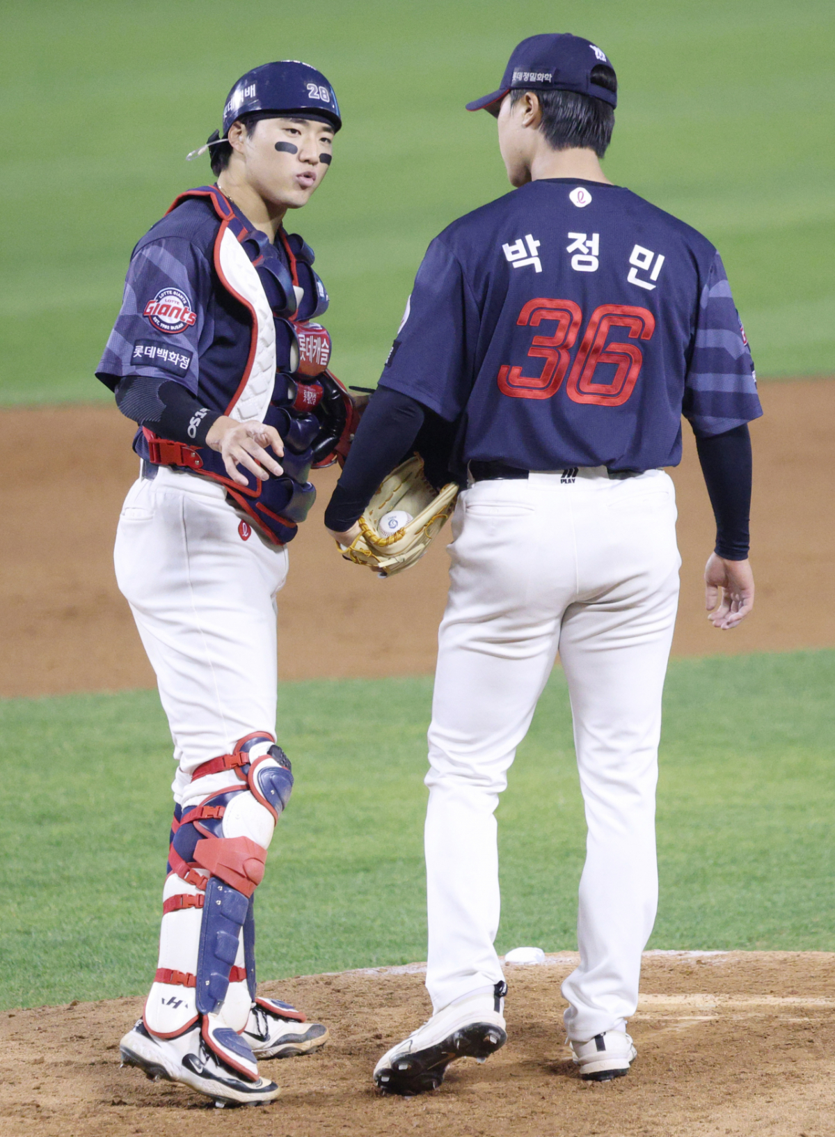 롯데 박정민이 흔들리는 모습을 보이자 포수 손성빈이 마운드로 올라가 진정시키고 있다.