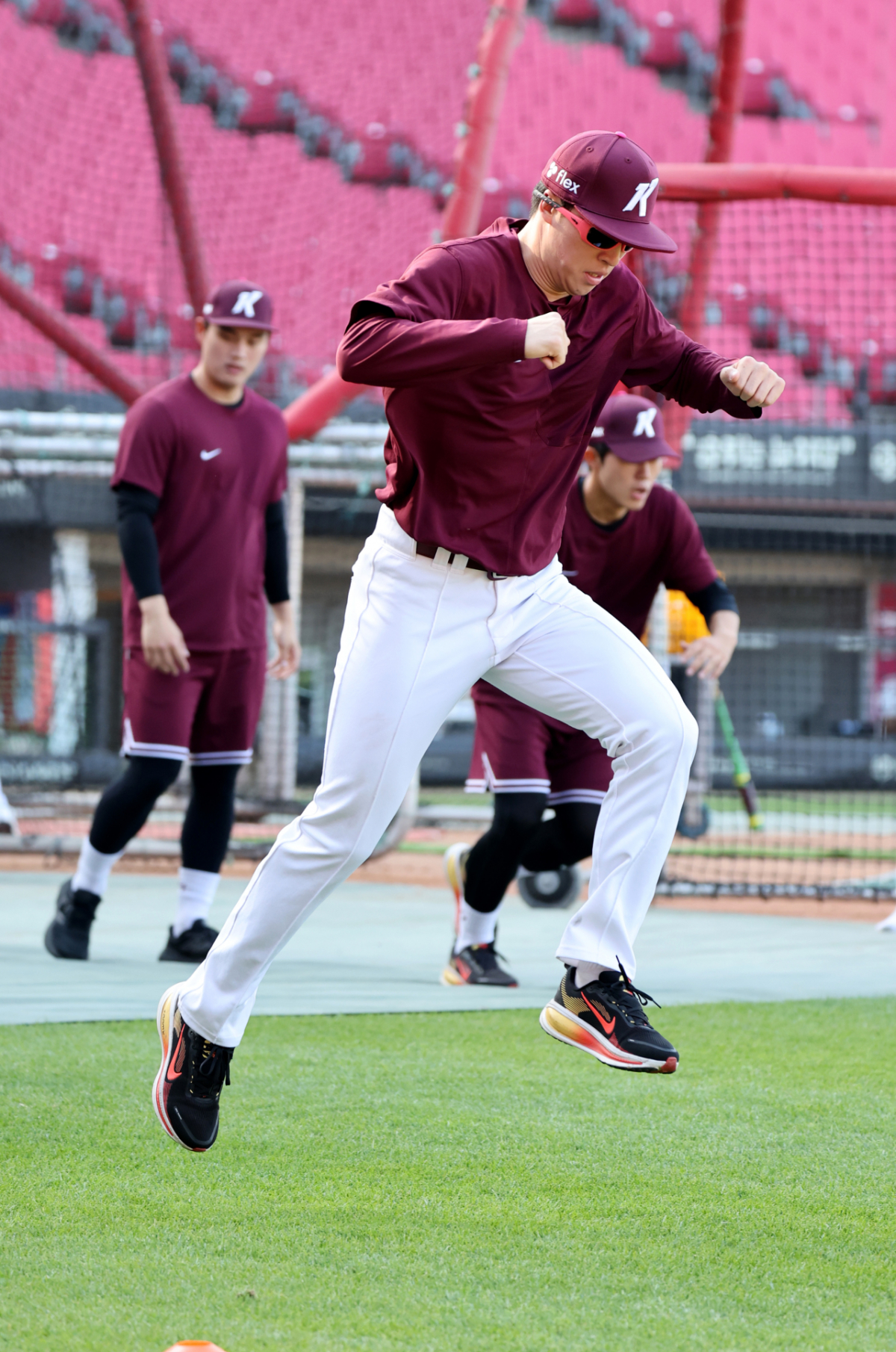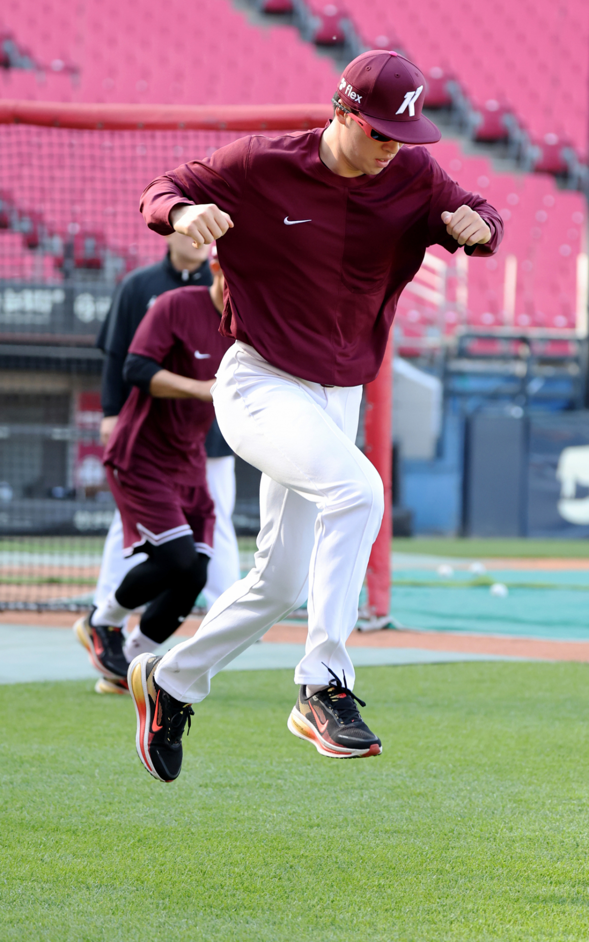 키움 복동이 선발투수 배동현이 16일 광주KIA챔피언스필드에서 열리는 2026KBO리그 기아타이거즈와 키움히어로즈의 경기를 앞두고 몸을 풀었다. 배동현은 구름 위를 걷는 듯한 모습으로 몸을 풀었다. 이 경기는 2026년 4월 16일에 진행되었다.