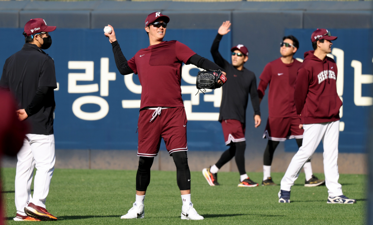 부상에서 조기복기한 안우진이 16일 광주KIA챔피언스필드에서 열리는 2026KBO리그 기아타이거즈와 키움히어로즈의 경기를 앞두고 외야에서 피칭을 하며 몸을 풀고 있다. 2026.04.16.