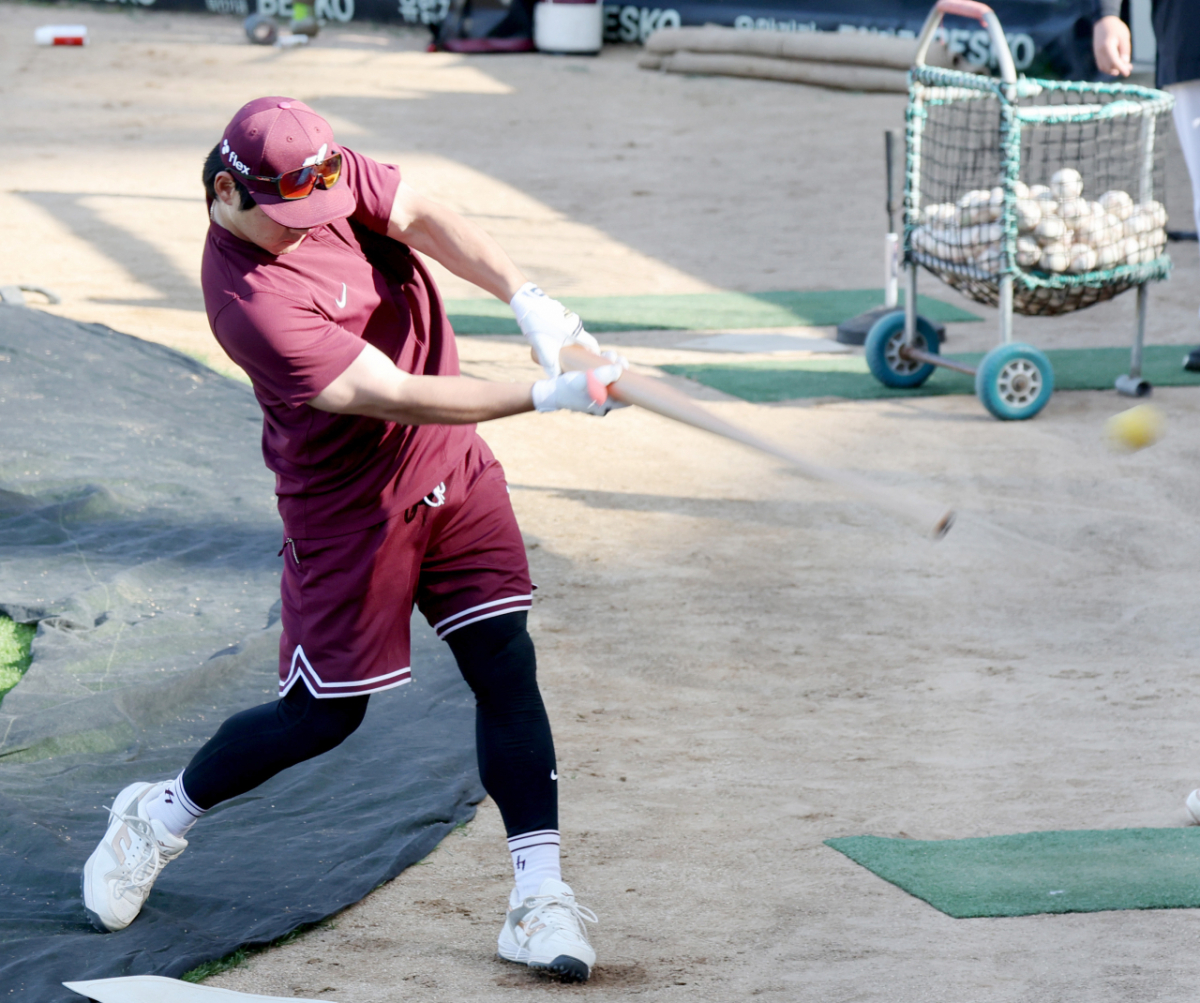 키움 주장 임지열이 16일 광주KIA챔피언스필드에서 열리는 2026KBO리그 기아타이거즈와 키움히어로즈의 경기를 앞두고 타격훈련을 하고 있다. 배트를 거꾸로 잡고 타격훈련을 하는 장면이 눈길을 끈다.2026.04.16.