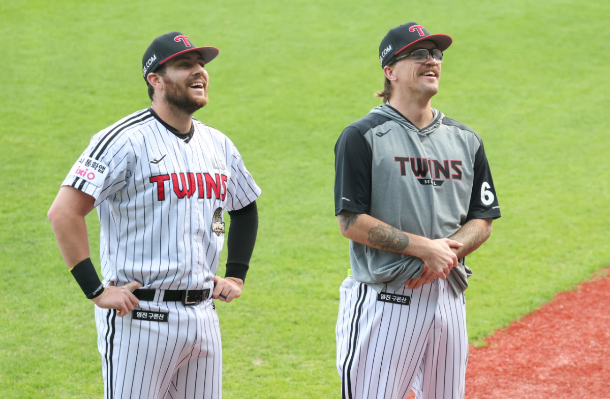LG 오스틴과 웰스가 경기 전 관중석의 가족과 미소로 소통하고 있다.