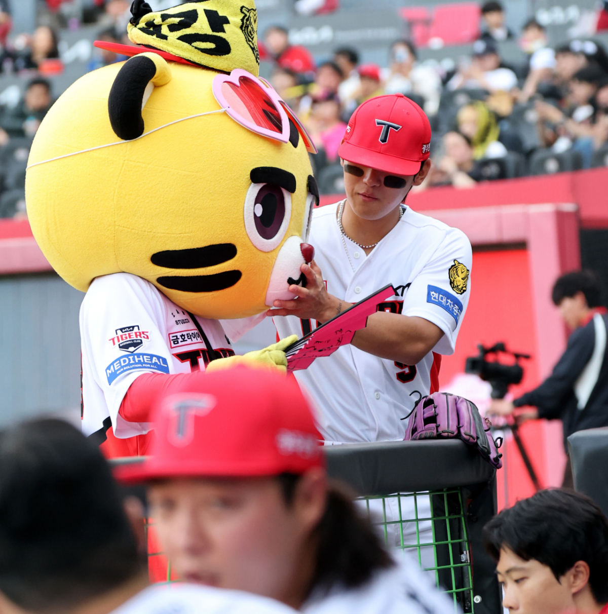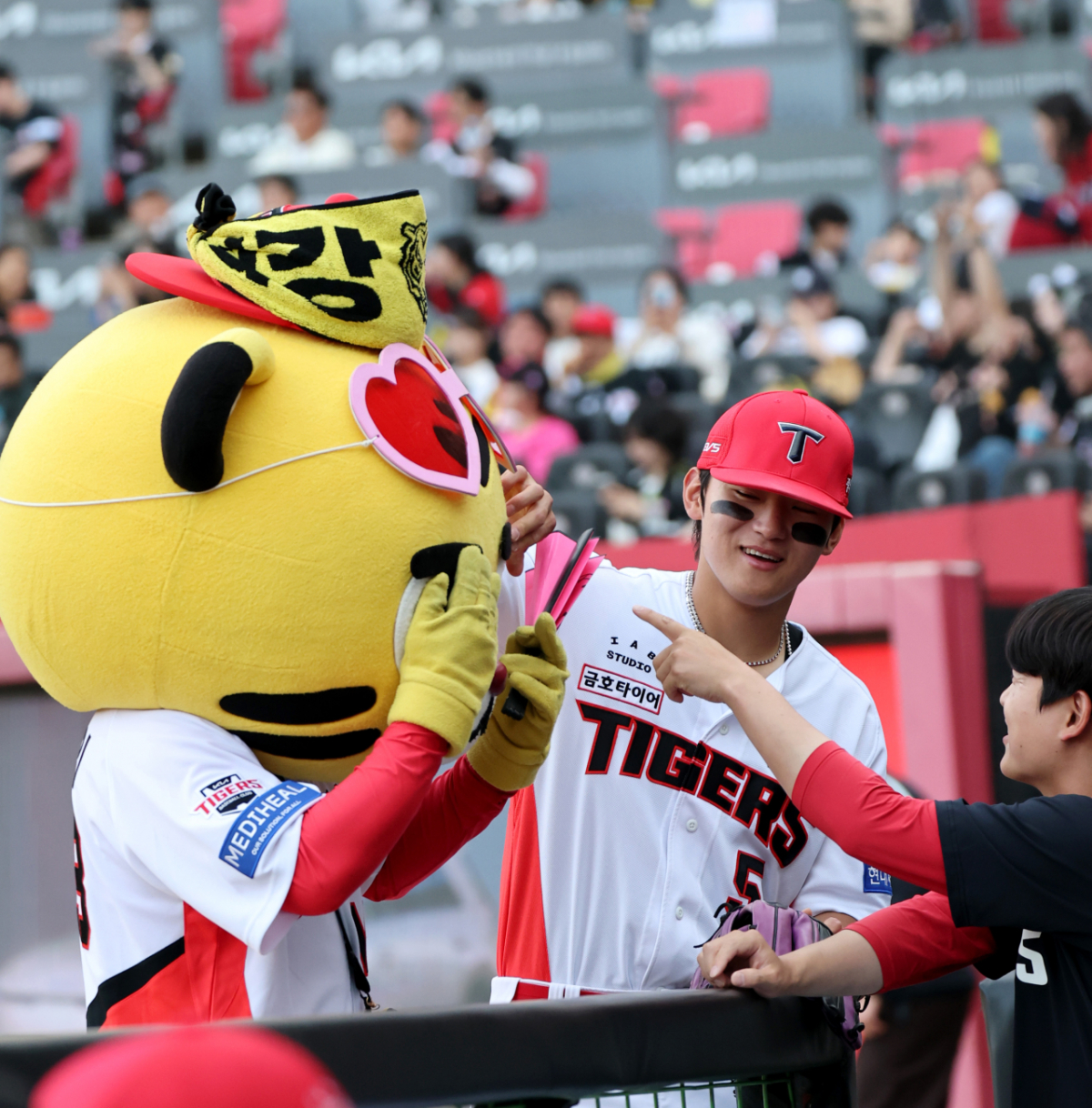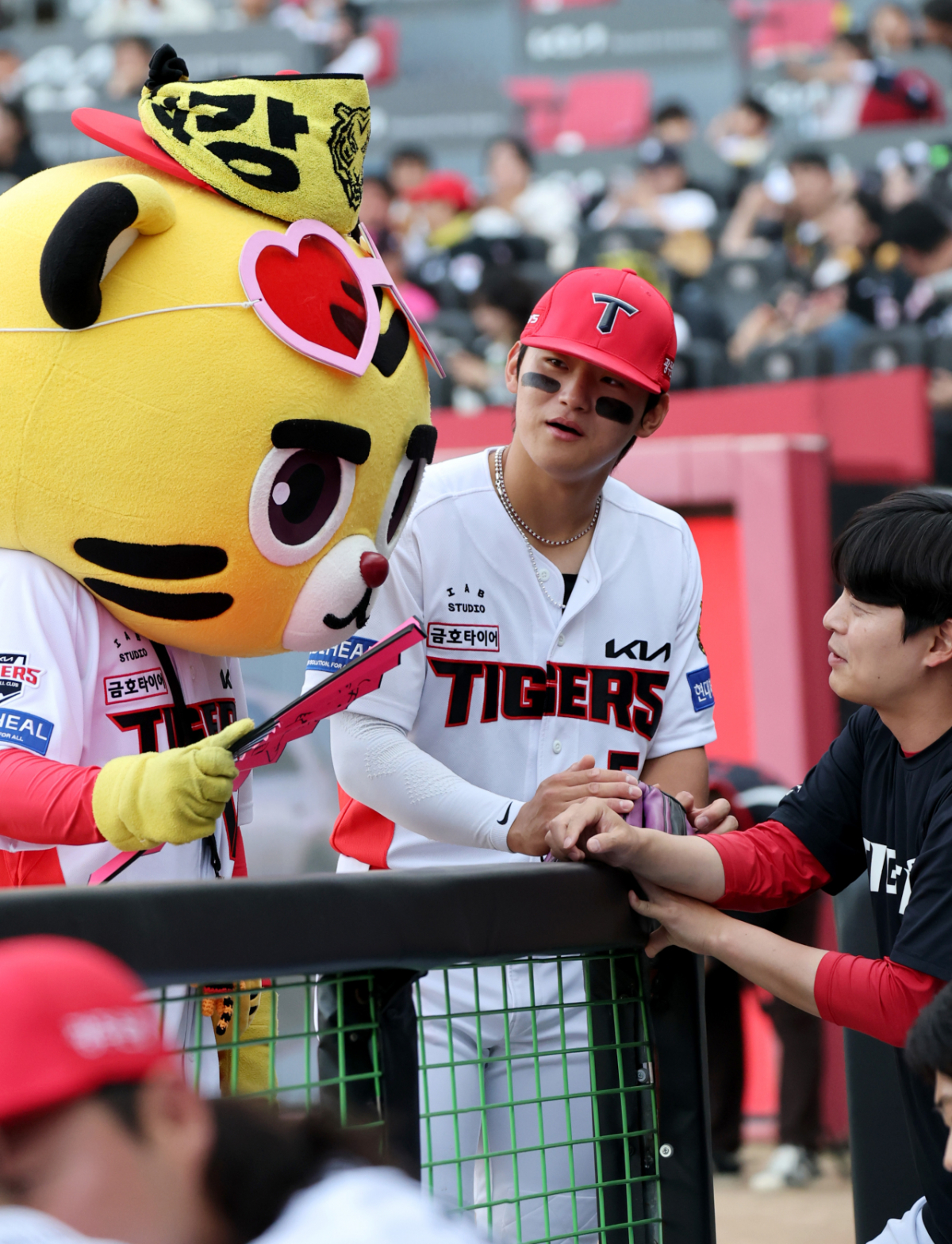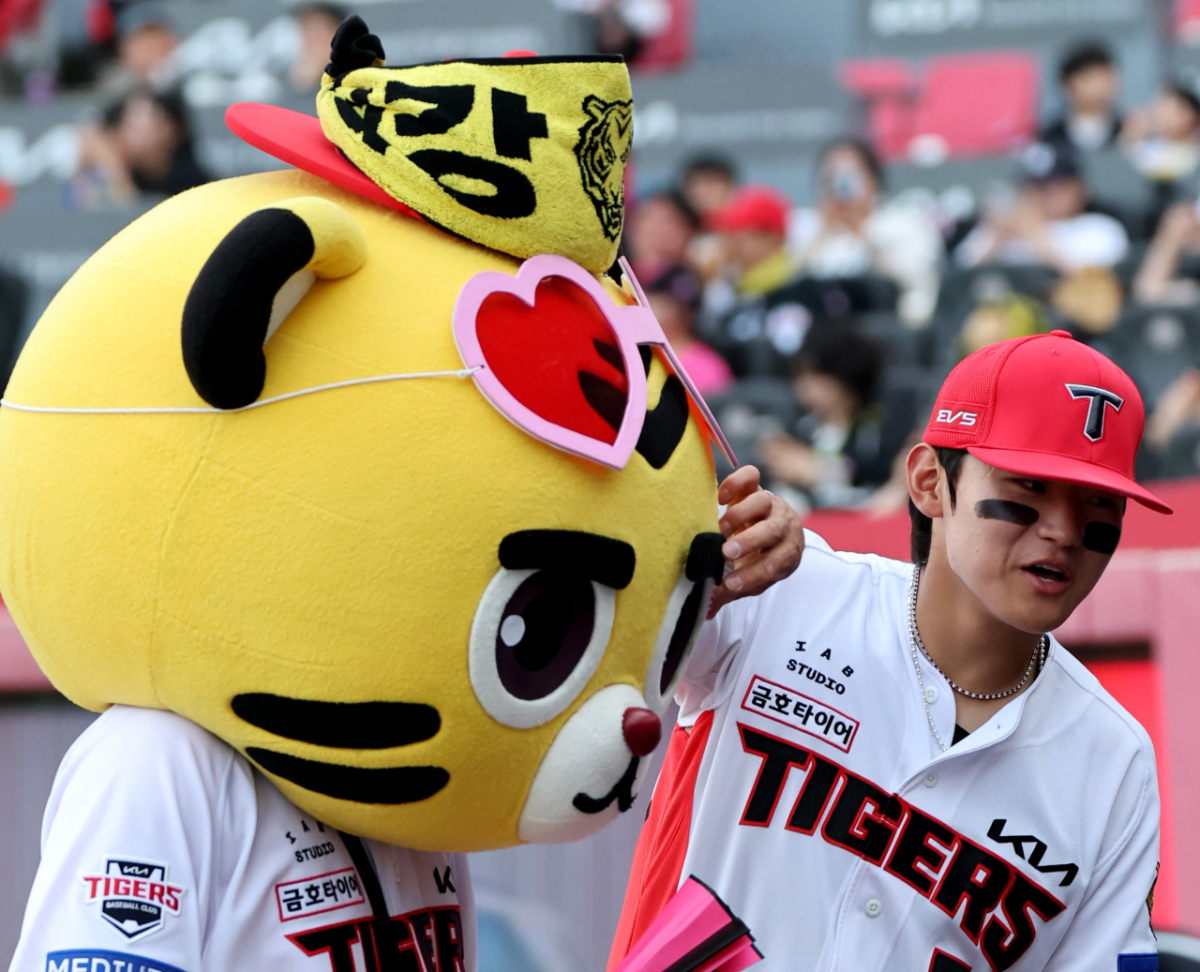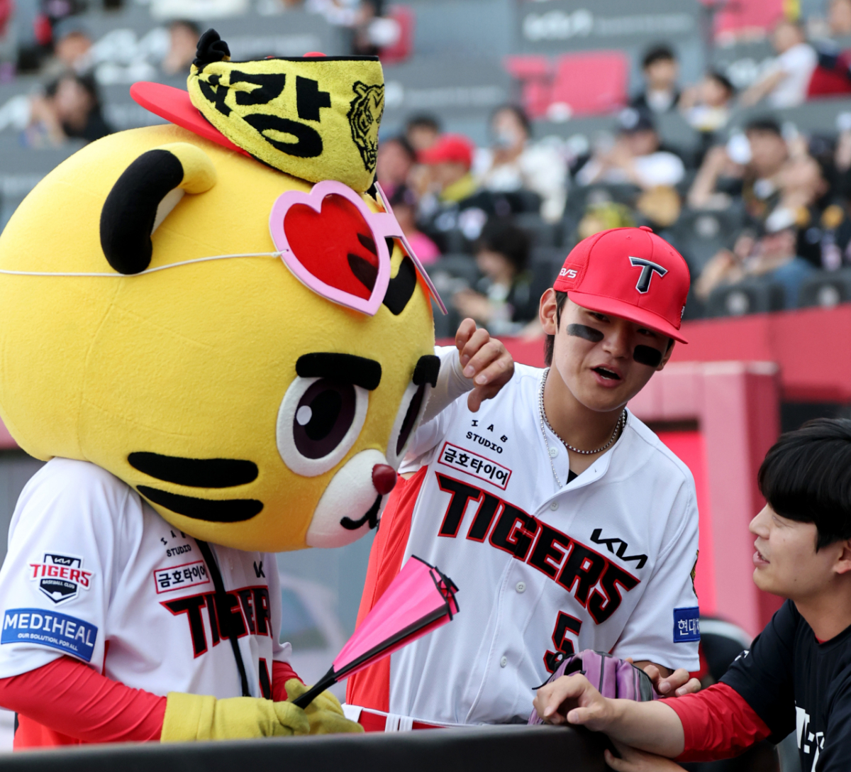 KIA 김도영이 16일 광주KIA챔피언스필드에서 열리는 2026KBO리그 기아타이거즈와 키움히어로즈의 경기 시작을 기다리던 중 마스코트 호걸이와 장난을 치고 있다.2026.04.16.