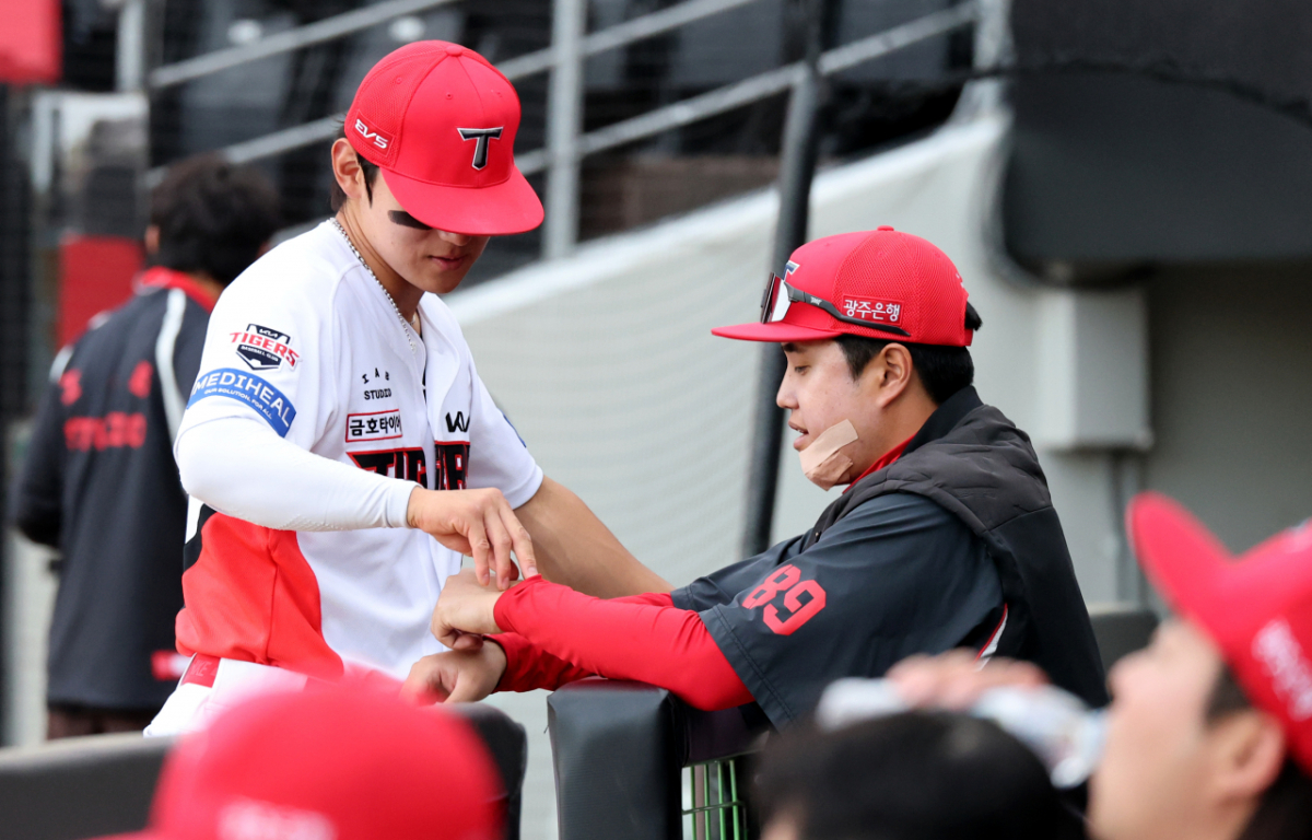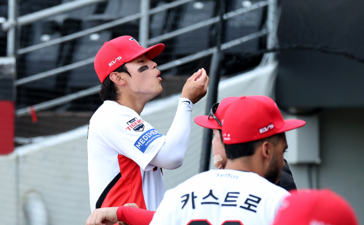 KIA 김도영이 16일 광주KIA챔피언스필드에서 열리는 2026KBO리그 기아타이거즈와 키움히어로즈의 경기 시작을 기다리던 중 손등의 털을 뽑는 장난을 치고 있다.2026.04.16.