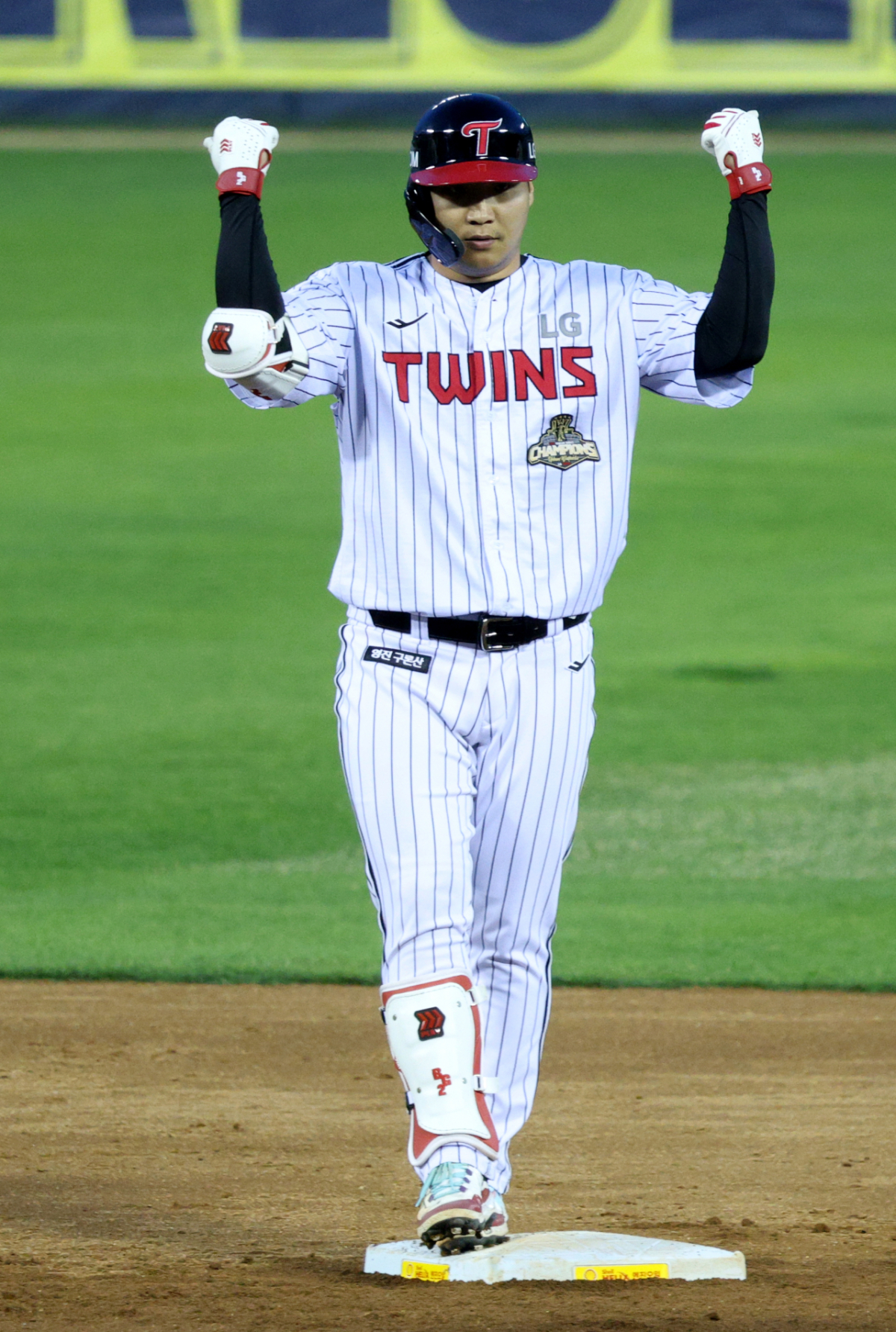 LG 문보경이 2회말 무사에서 우중월 2루타를 날리고 출루한 후 세리머니를 하고 있다.
