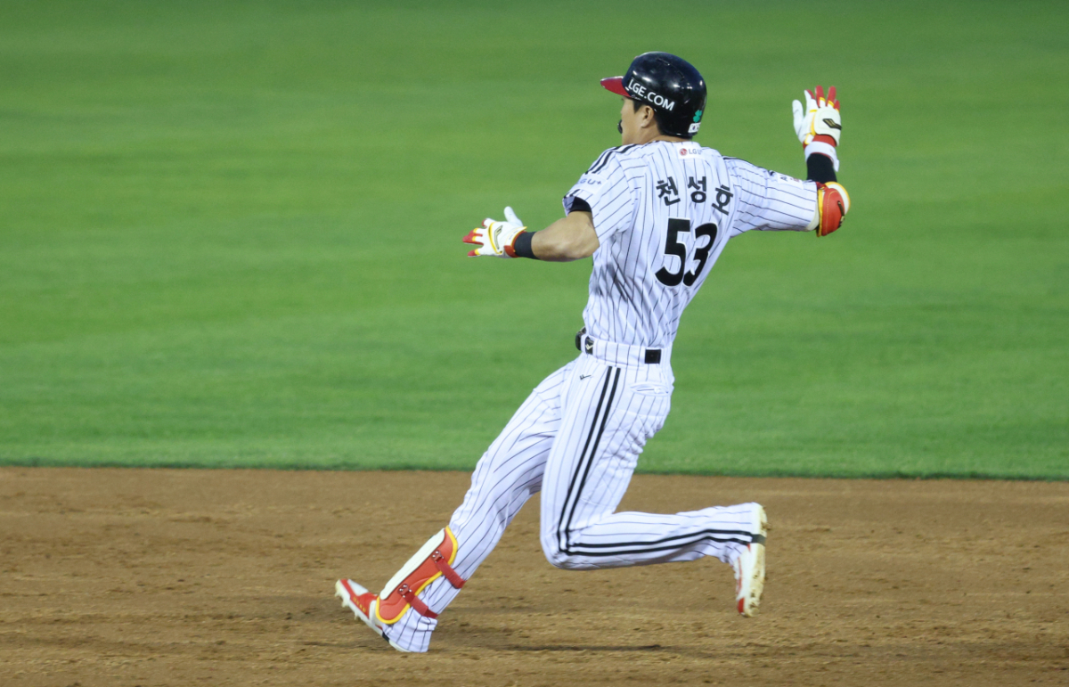 LG 천성호가 2회말 1사 2루에서 동점 1타점 적시 2루타를 날리고 질주하고 있다.