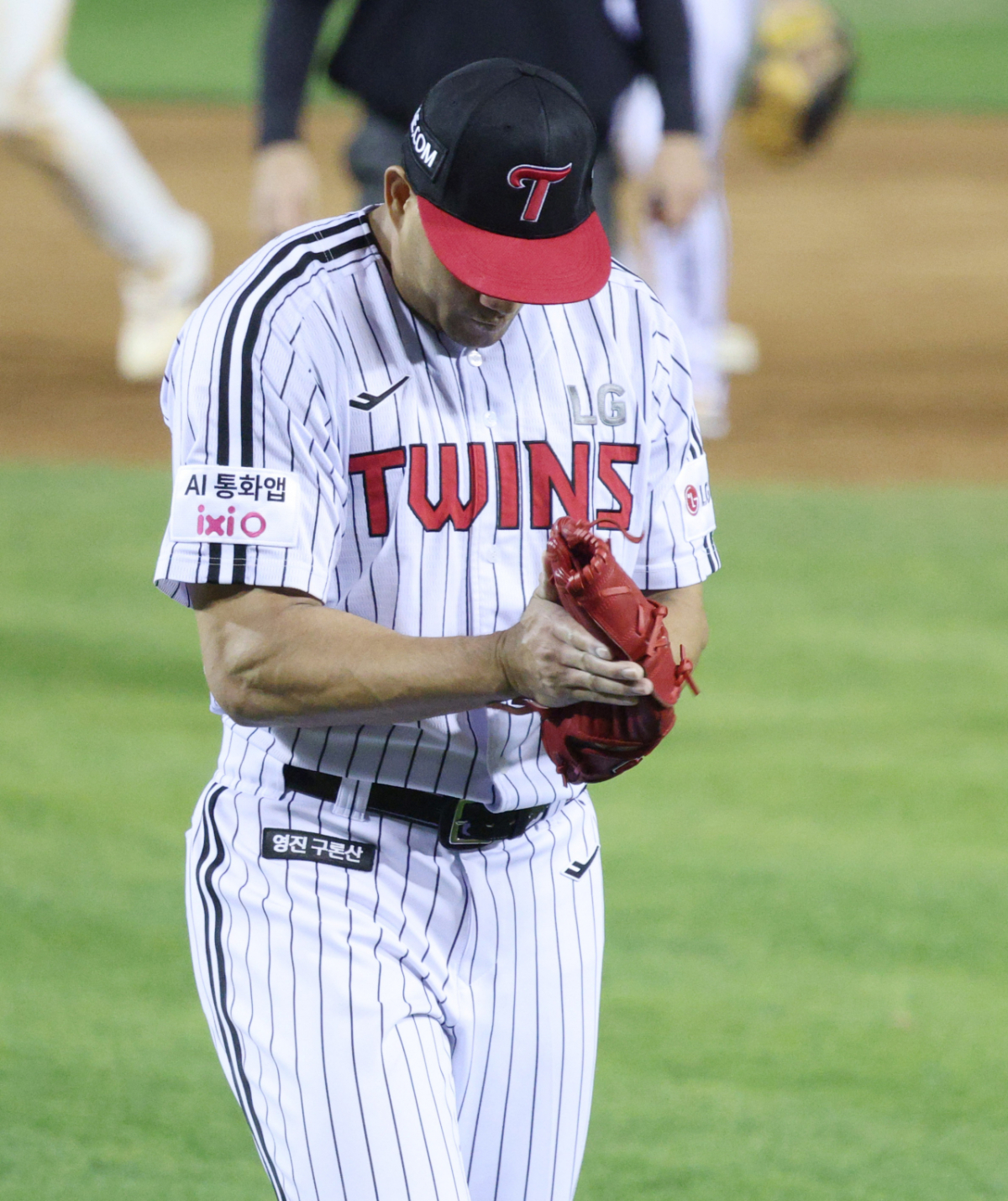 LG 선발 치리노스가 5회 투구를 마친 후 더그아웃으로 향하고 있다.