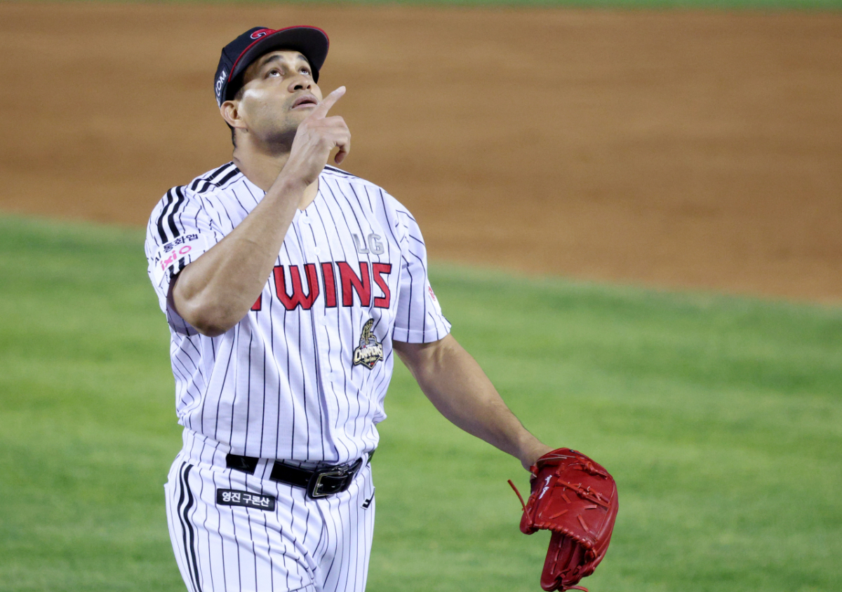 LG 선발 치리노스가 5회 투구를 마친 후 더그아웃으로 향하고 있다.