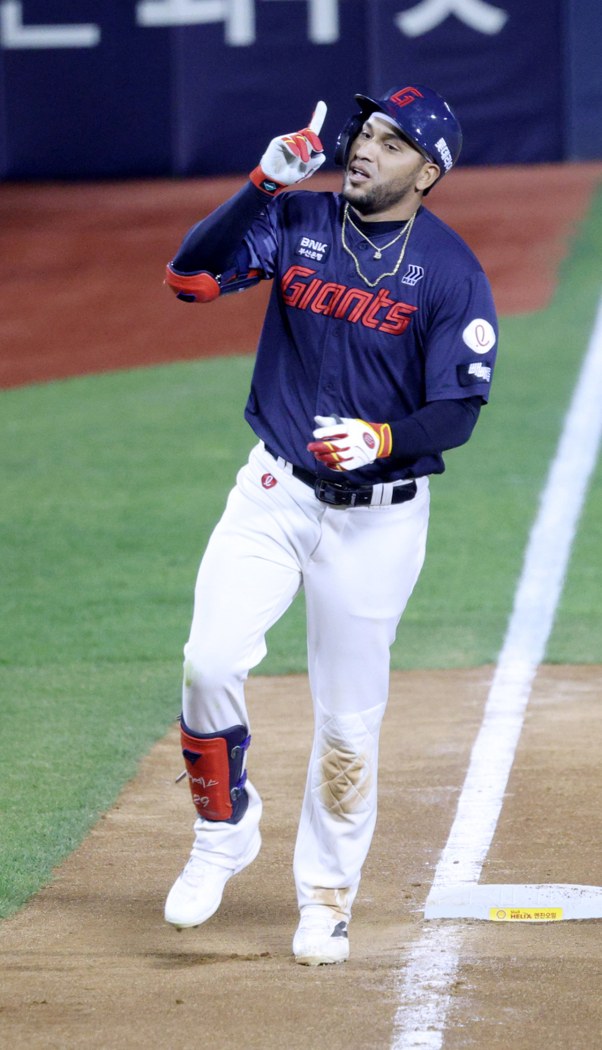 롯데 레이예스가 6회초 2사 1루에서 LG 장현식을 상대로 동점 2점 홈런을 날리고 홈인하고 있다.