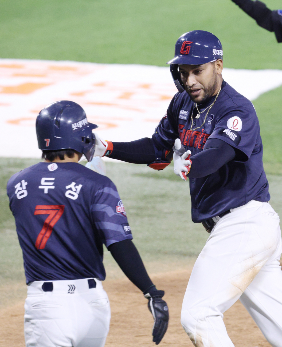롯데 레이예스가 6회초 2사 1루에서 LG 장현식을 상대로 동점 2점 홈런을 날리고 홈인하고 있다.