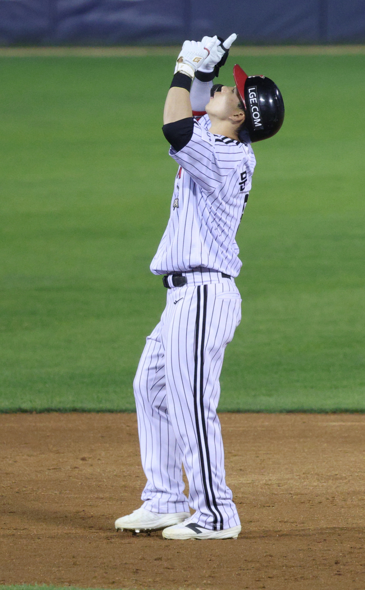 LG 문성주가 5회말 2사에서 좌월 2루타를 날리고 출루한 후 세리머니를 하고 있다.