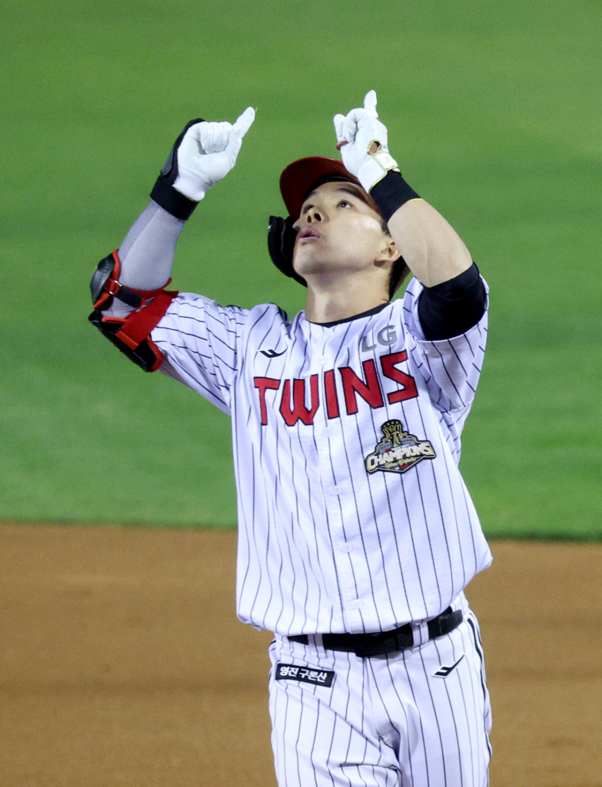 LG 문성주가 6회말 2사 만루에서 역전 2타점 적시타를 날리고 출루한 후 세리머니를 하고 있다.
