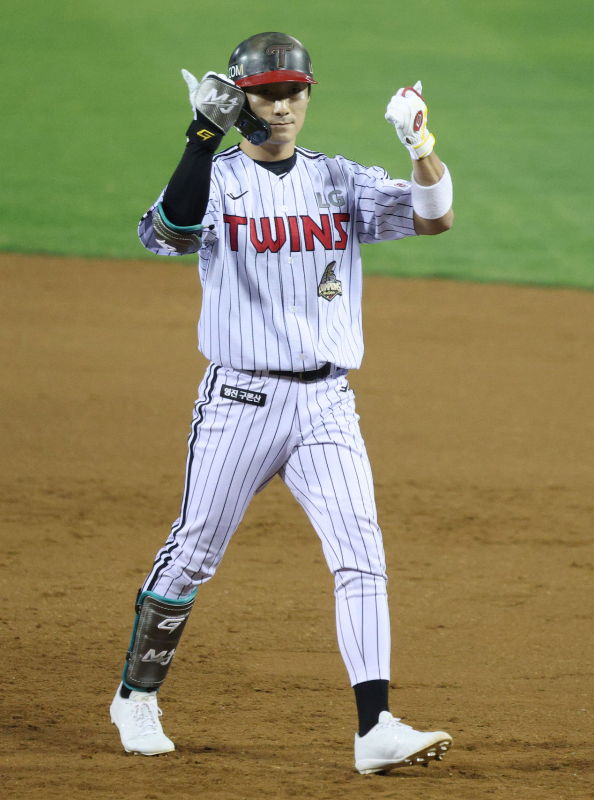 LG 신민재가 7회말 2사 2루에서 1타점 적시타를 날리고 출루한 후 세리머니를 하고 있다.