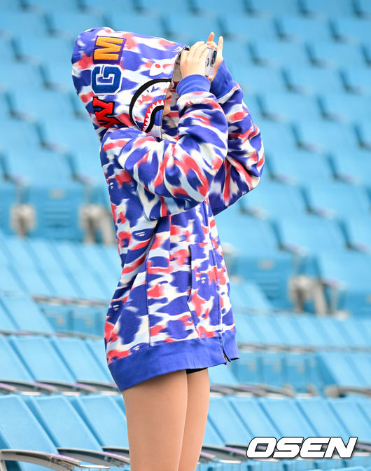 비 예보로 우천 취소 가능성도 있는 가운데 삼성 박소영 치어리더가 공연 연습을 하고 있다. 2026.04.17/ [email protected]