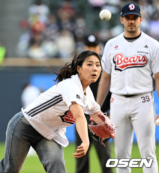 경기에 앞서 여자야구 국가대표 박주아가 시구를 하고 있다. 2026.04.17 /[email protected]
