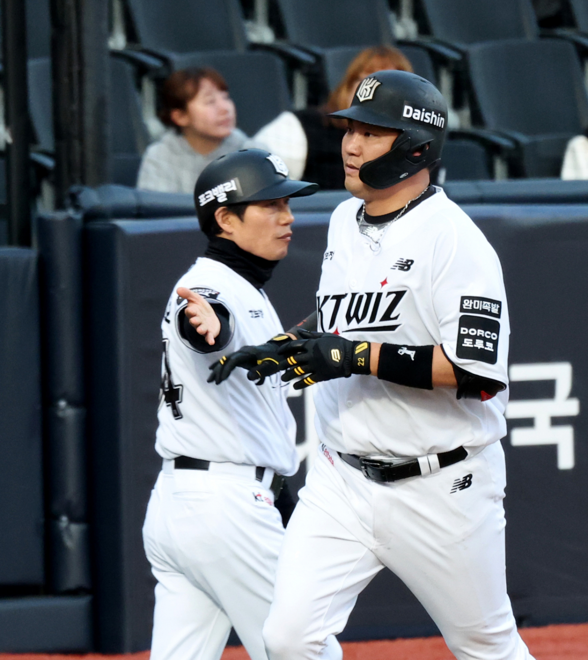 KT 4번타자 장성우가 17일 수원KT위즈파크에서 열린 2026KBO리그 KT위즈와 키움히어로즈의 경기 1회말 2사후 솔로홈런을 터트린 후 홈인하고 있다. 2026.04.17.