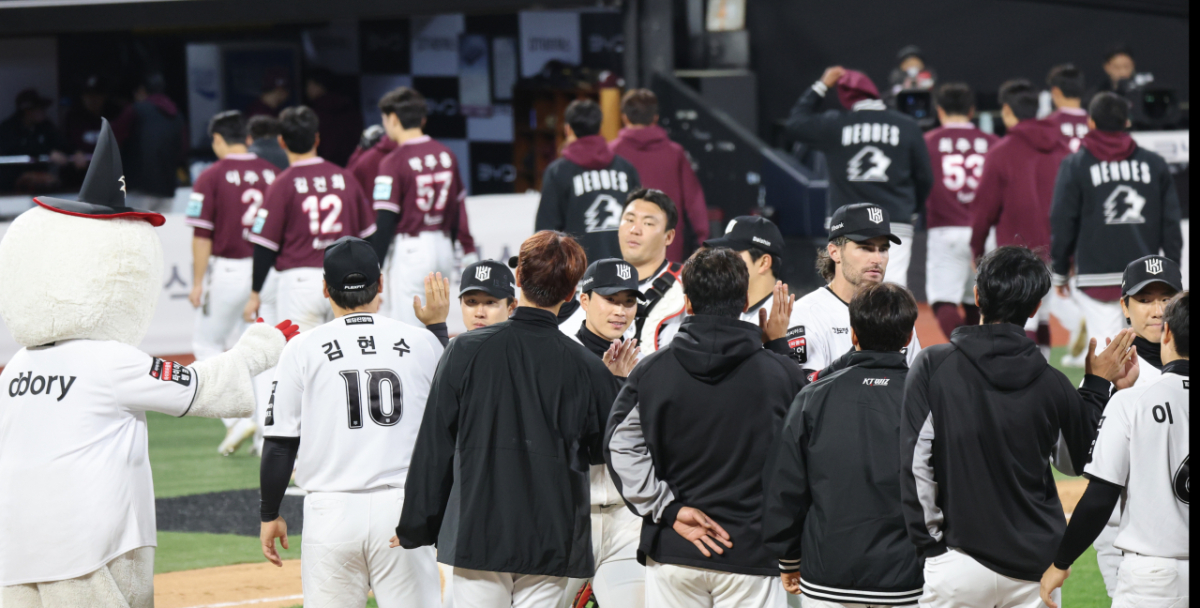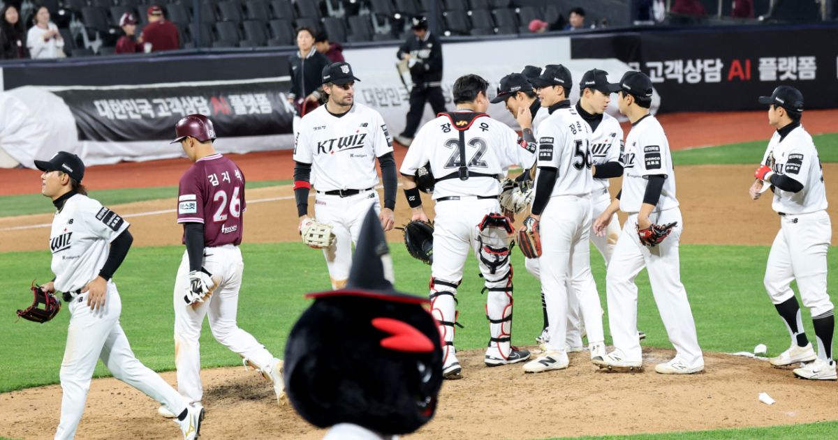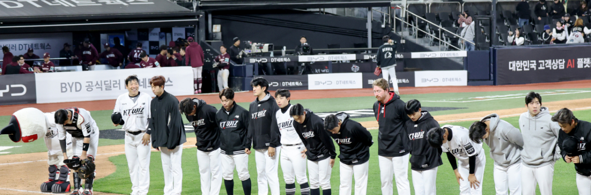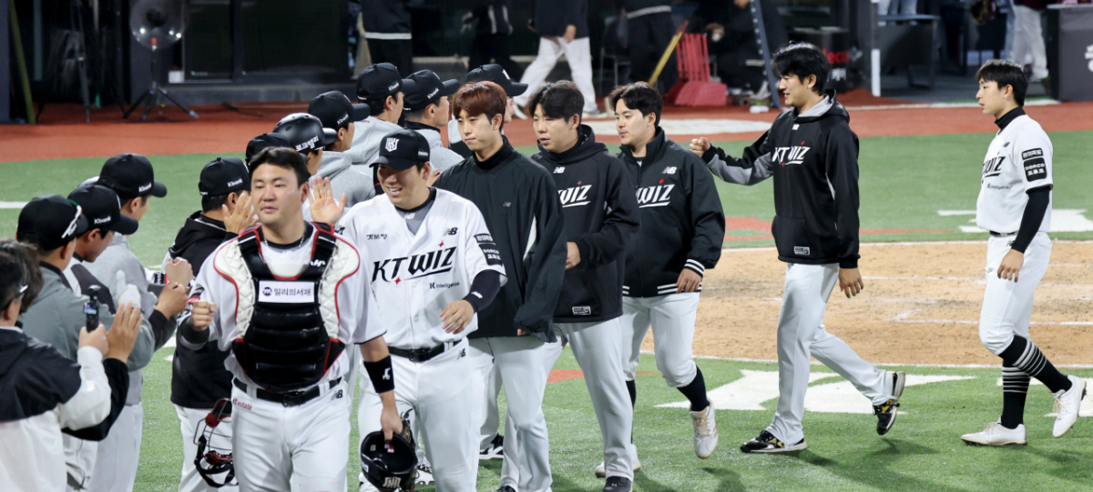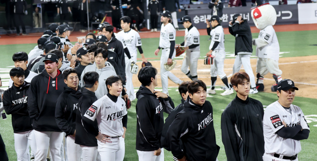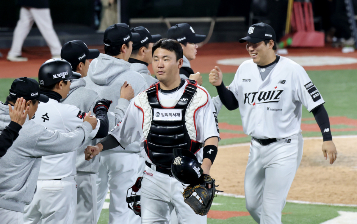 KT 포수 장성우 등 선수들이 17일 수원KT위즈파크에서 열린 2026KBO리그 KT위즈와 키움히어로즈의 경기에서 5-0으로 승리한 후 이강철 감독의 축하를 받고 있다. 키움은 4연패에 빠졌다.