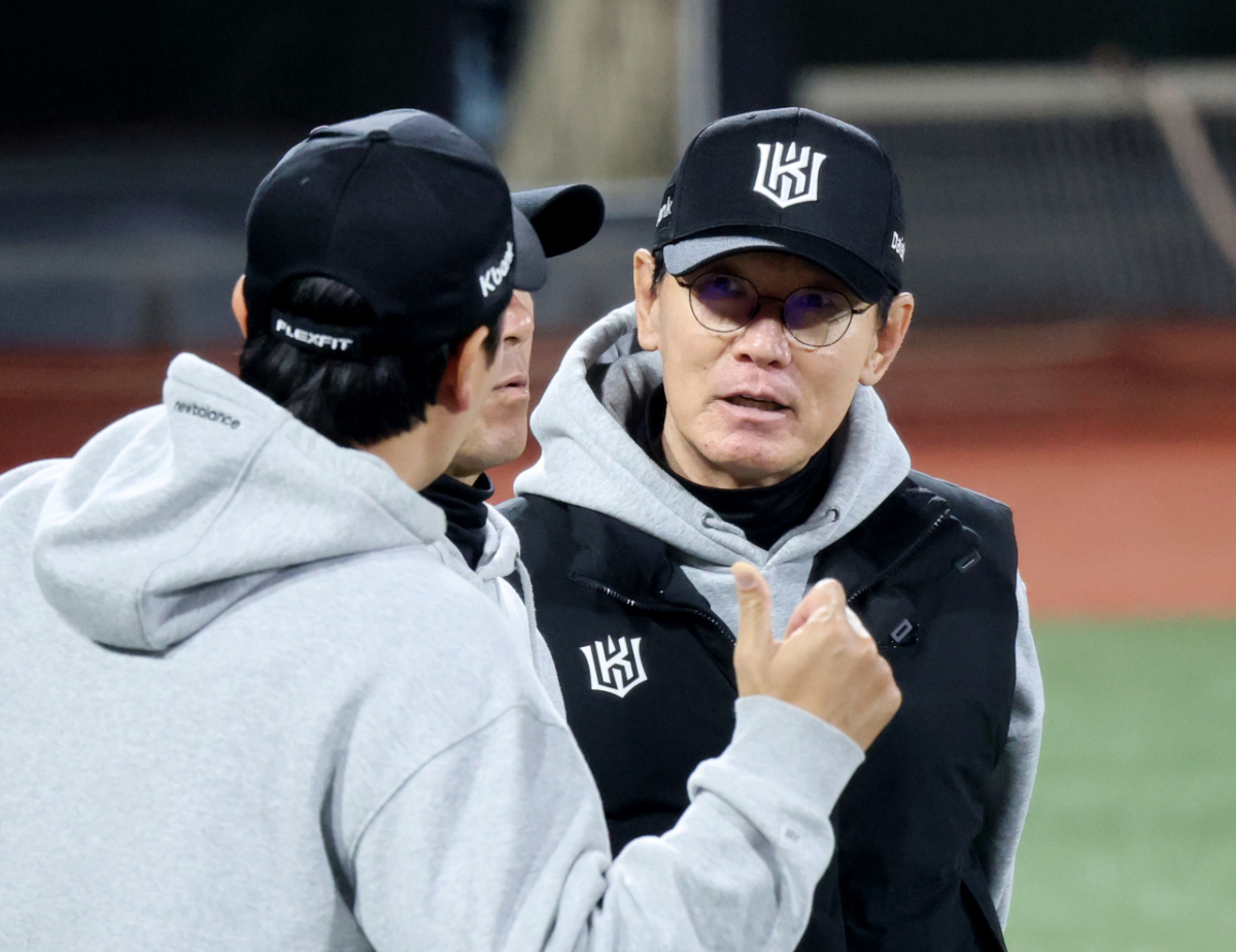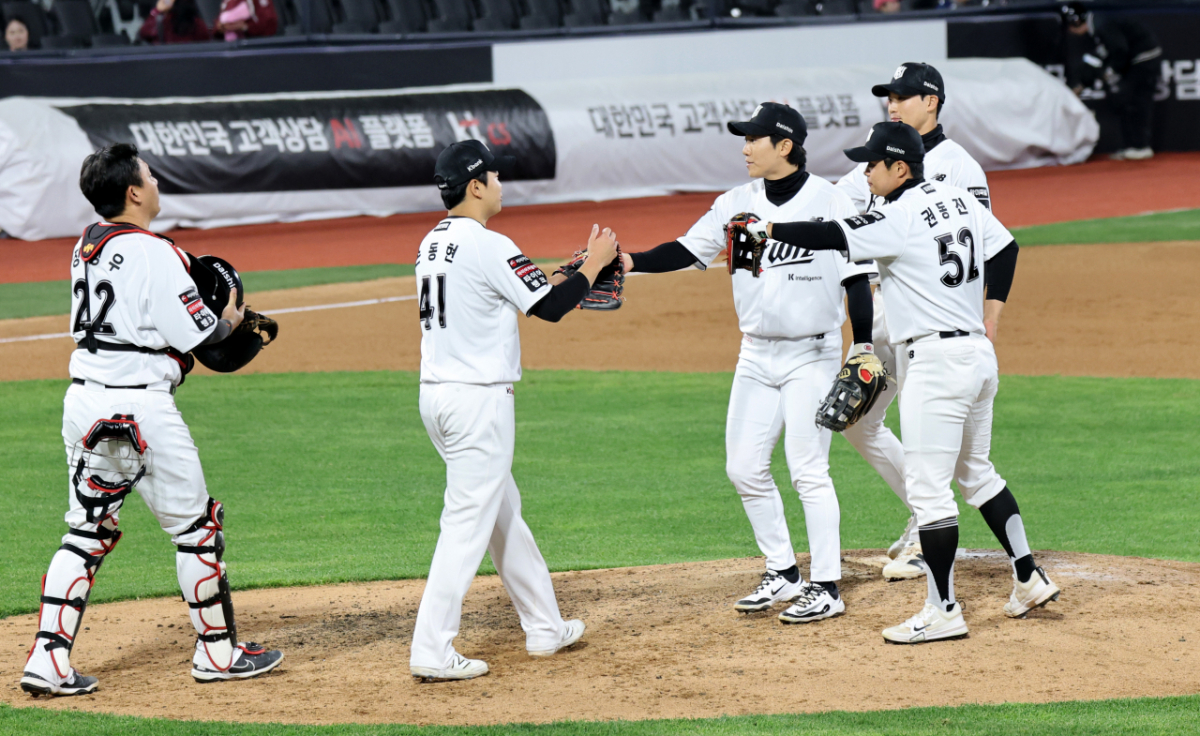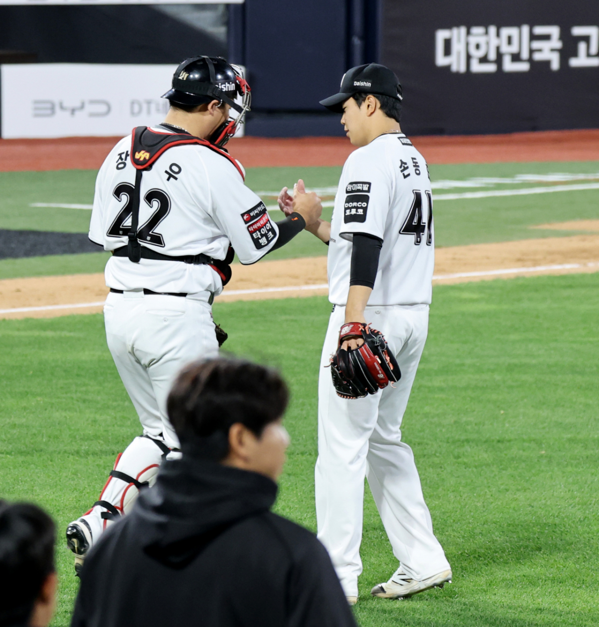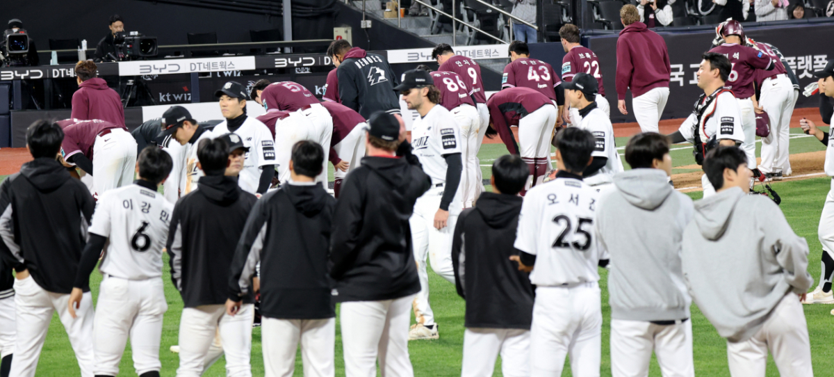 KT 포수 장성우 등 선수들이 17일 수원KT위즈파크에서 열린 2026KBO리그 KT위즈와 키움히어로즈의 경기에서 5-0으로 승리한 후 이강철 감독의 축하를 받고 있다. 키움은 4연패에 빠졌다.