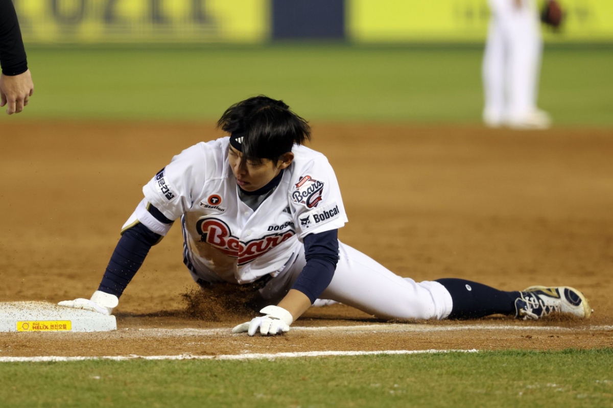선두타자 손아섭이 상대 유격수 포구 실채으로 출루했다. 후속 강승호는 삼구 삼진 아웃. 이어 이유찬 타석 때 대타 김인태가 등장, 2루 땅볼로 물러났다. 이 사이 1루 주자 손아섭은 2루까지 갔다.
