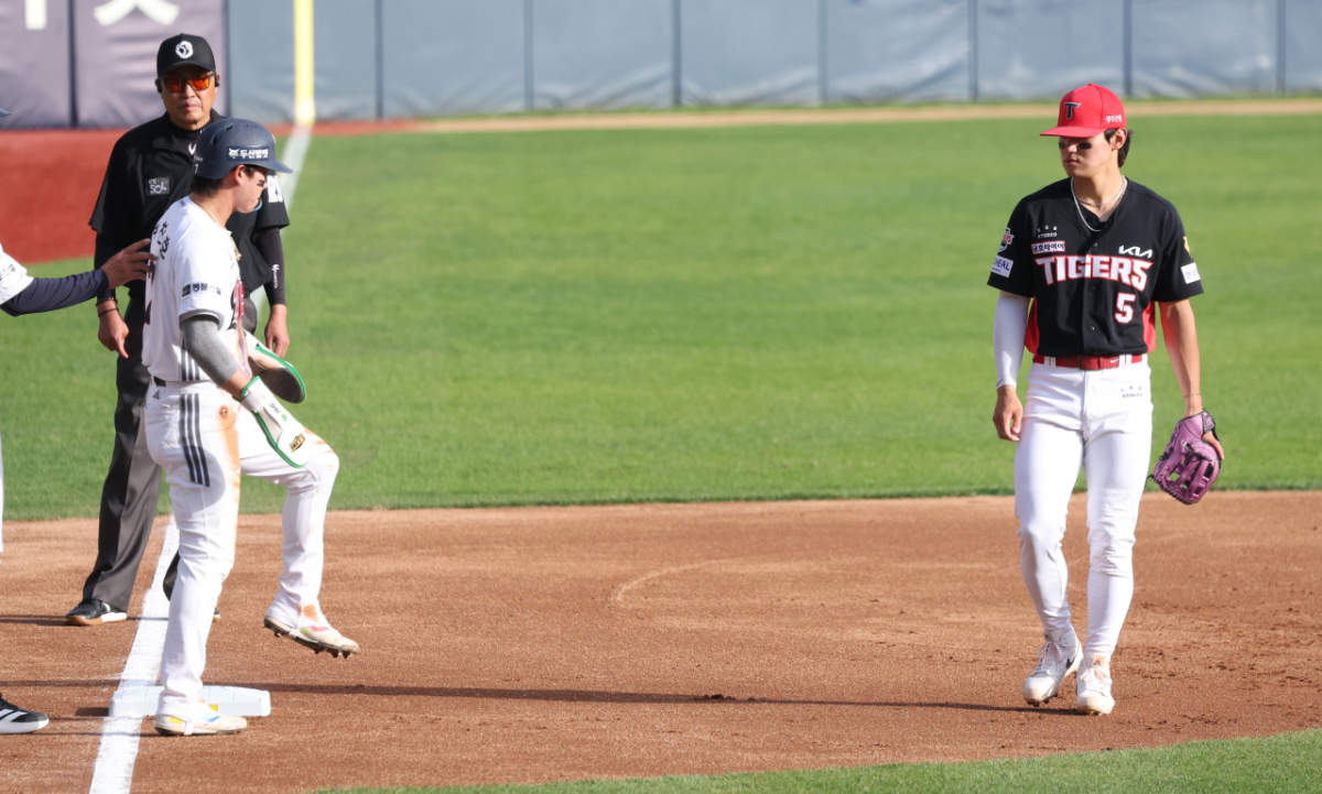 두산 박찬호가 1회말 손아섭의 내야땅볼 때 3루까지 진루한 후 KIA 3루수 김도영에게 장난을 걸고 있다.