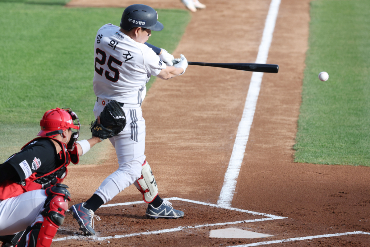두산 양의지가 1회말 2사 3루에서 1타점 내야땅볼을 날리고 있다.