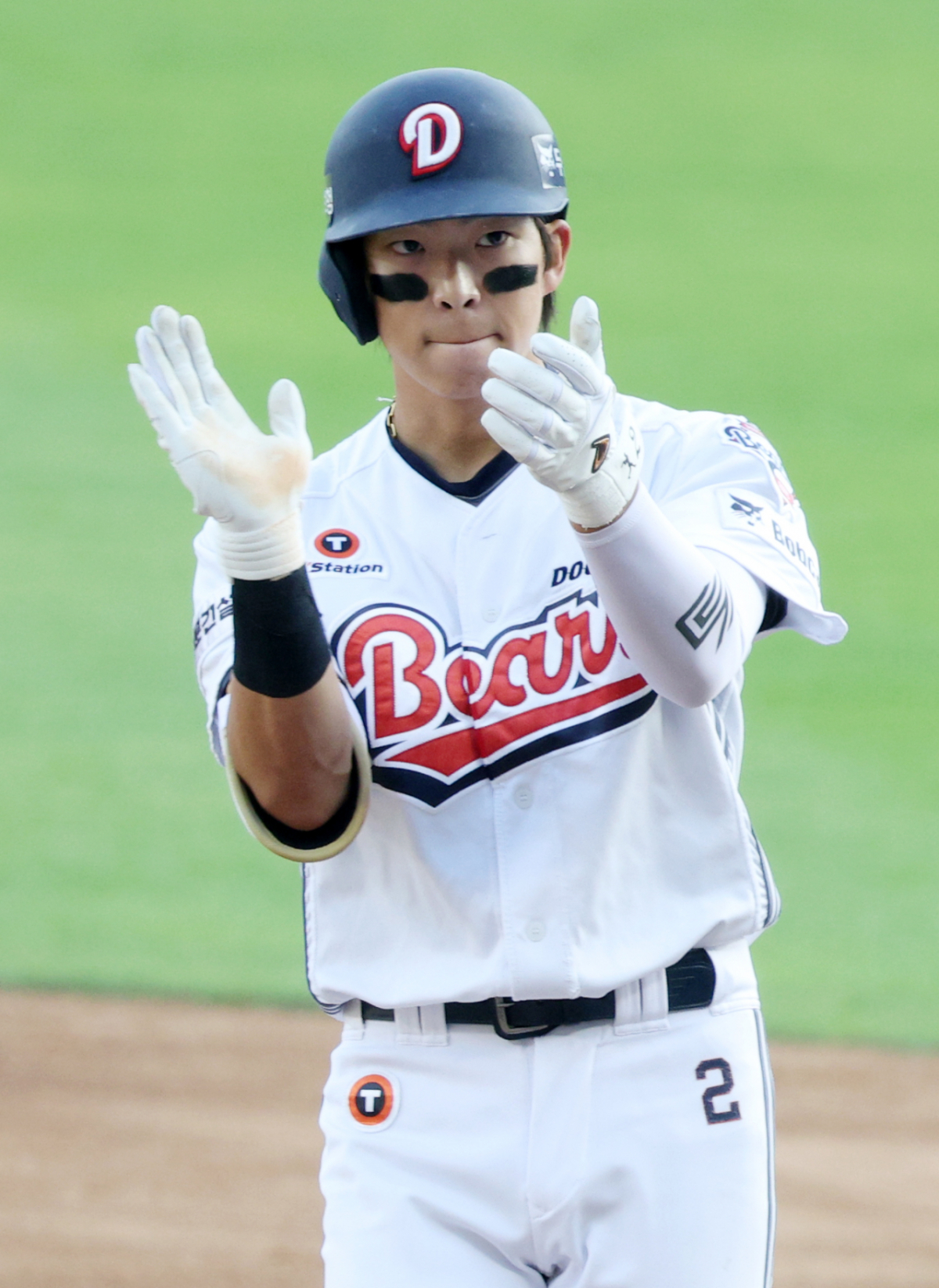 두산 김민석이 3회말 2사 3루에서 1타점 적시타를 날리고 출루한 후 세리머니를 하고 있다.
