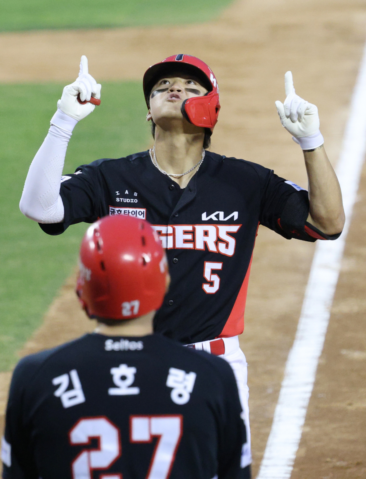 KIA 김도영이 8회초 1사 2루에서 두산 김택연을 상대로 역전 2점 홈런을 날리고 홈인하고 있다.