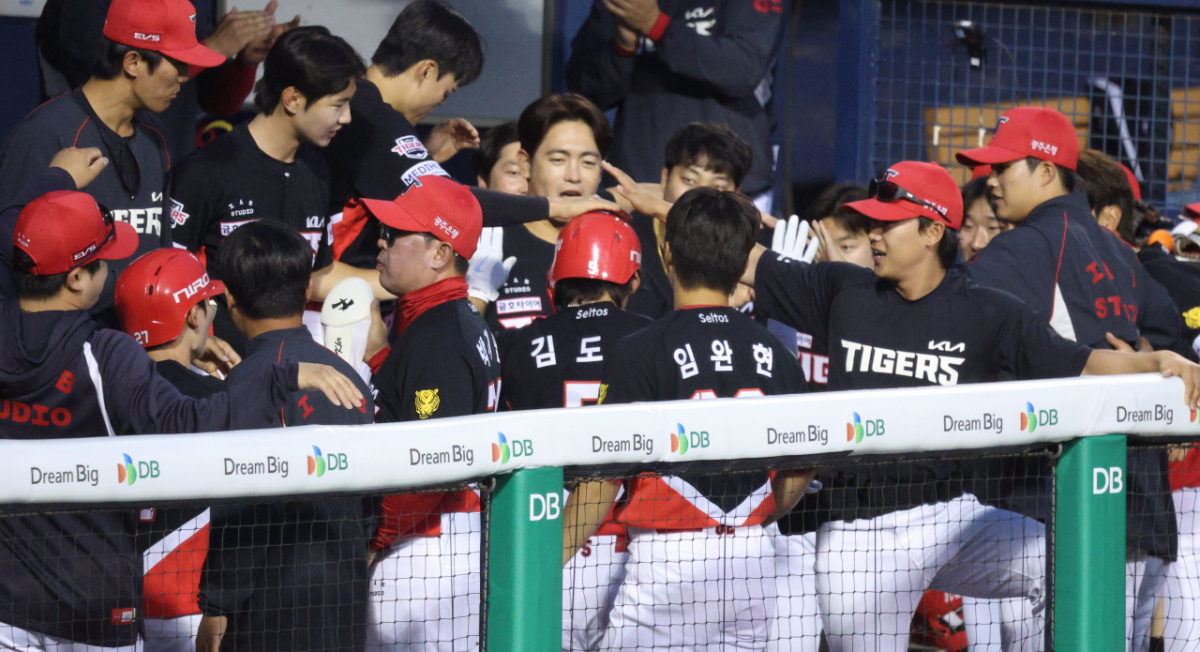 KIA 김도영이 8회초 1사 2루에서 두산 김택연을 상대로 역전 2점 홈런을 날리고 홈인한 후 동료들의 환영을 받고 있다.