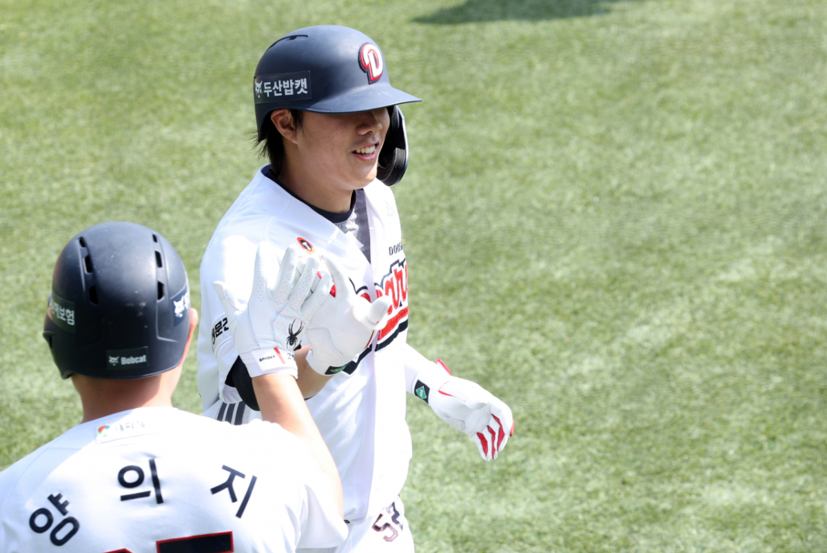 두산 박준순이 3회말 1사에서 KIA 선발 양현종을 상대로 좌월 1점 홈런을 날리고 홈인하고 있다.
