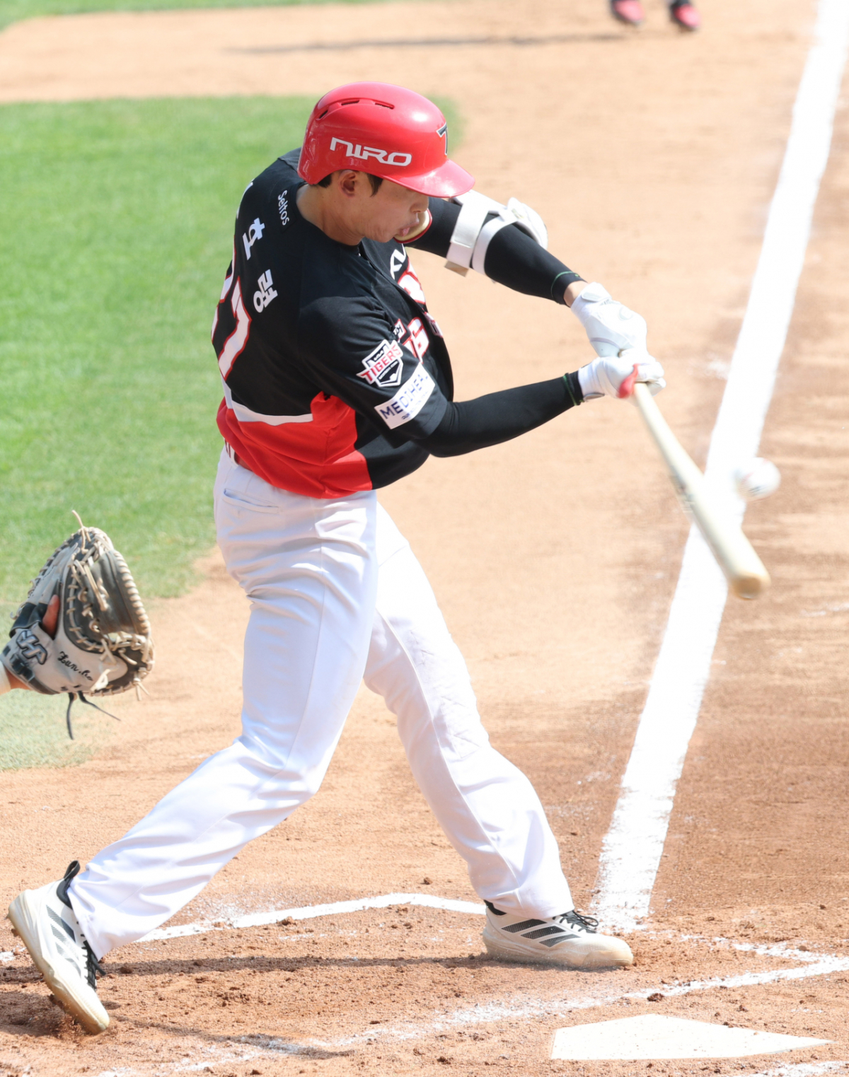 KIA 김호령이 4회초 1사 2,3루에서 1타점 적시타를 날리고 있다.