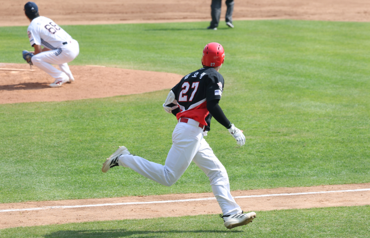 KIA 김호령이 4회초 1사 2,3루에서 1타점 적시타를 날리고 질주하고 있다.