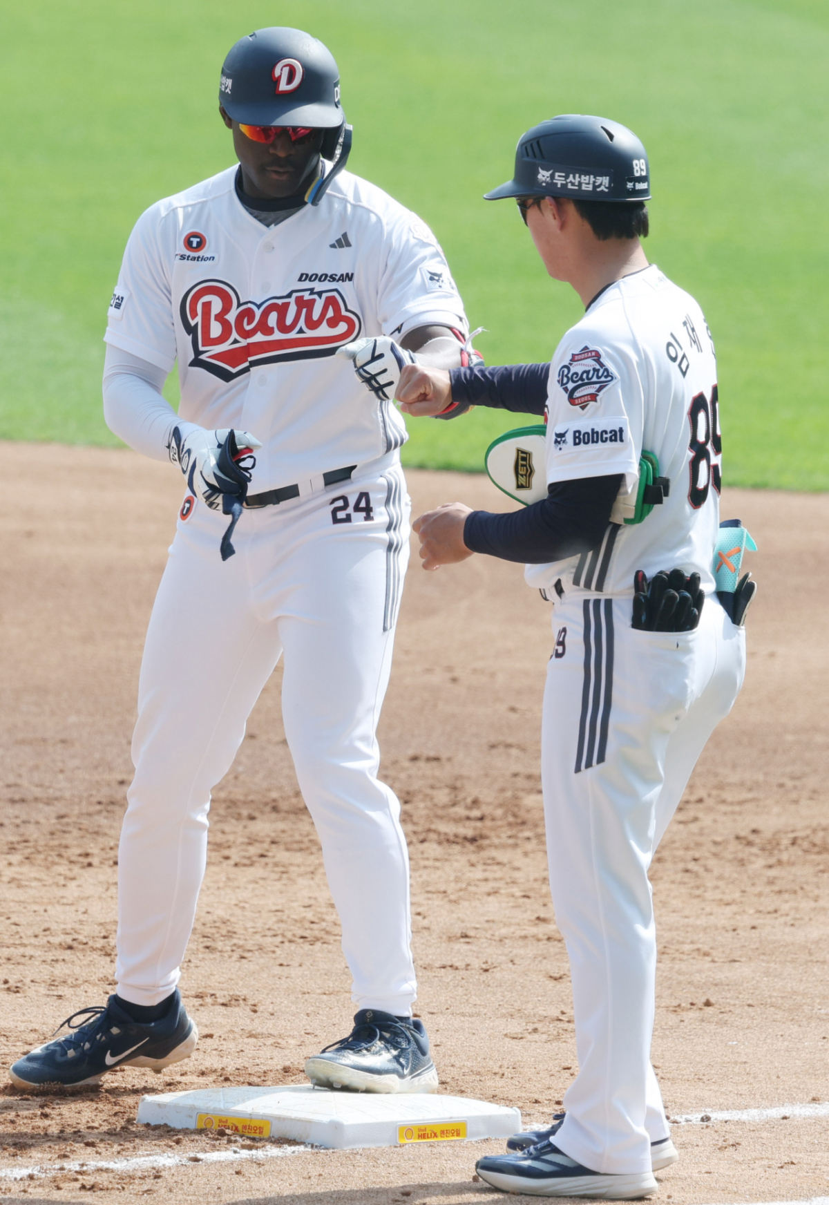 두산 카메론이 4회말 1사에서 중전 안타로 출루한 후 임재현 코치의 환영을 받고 있다.